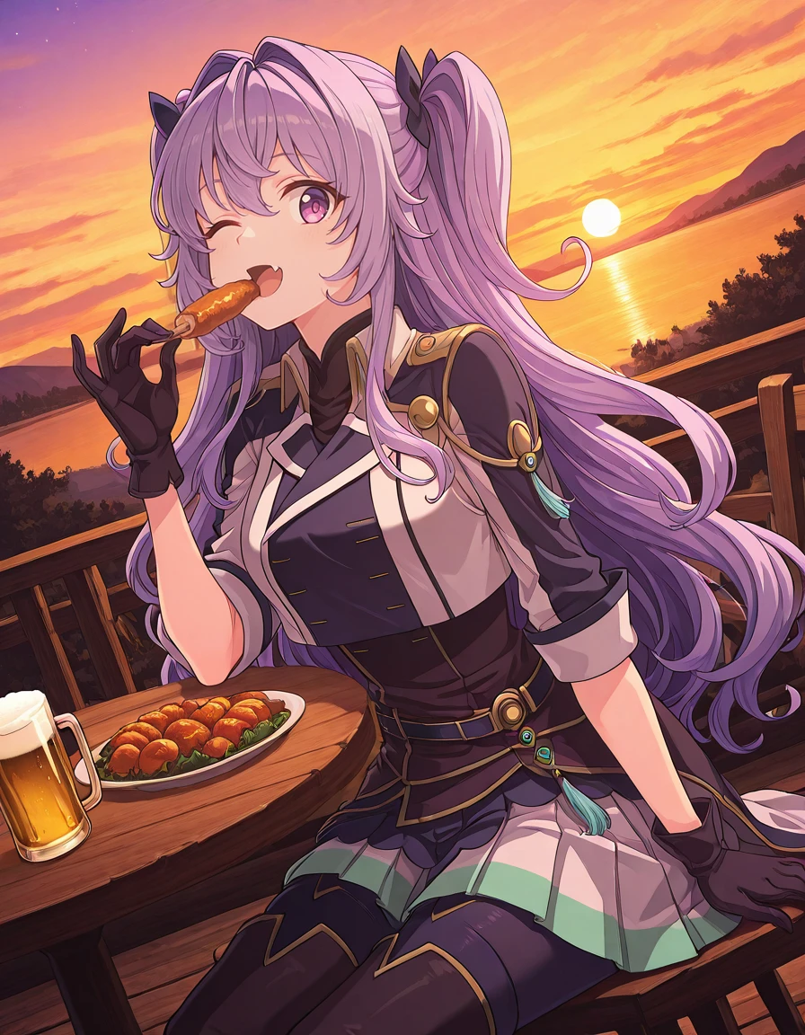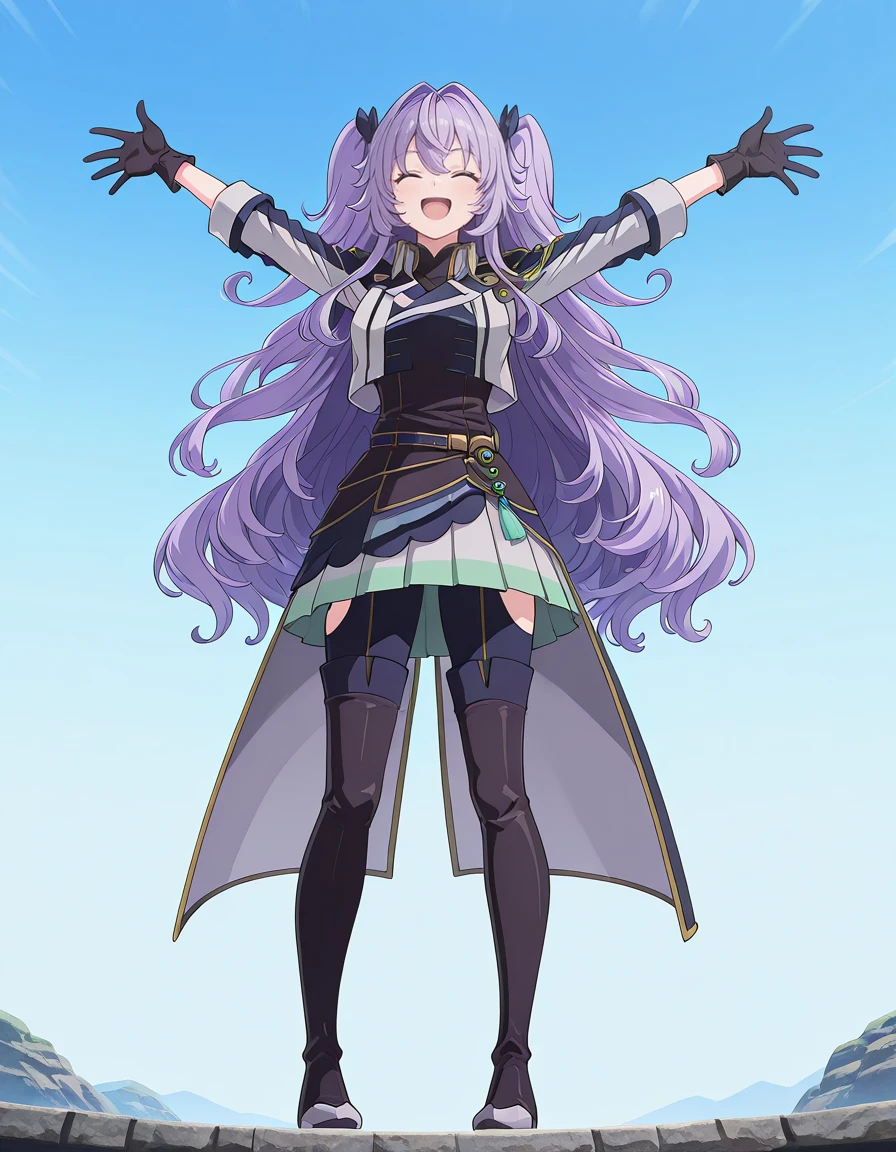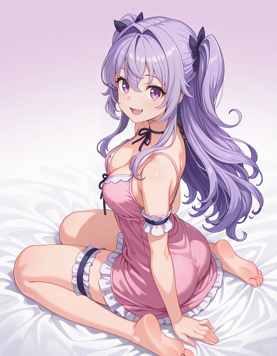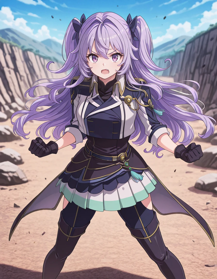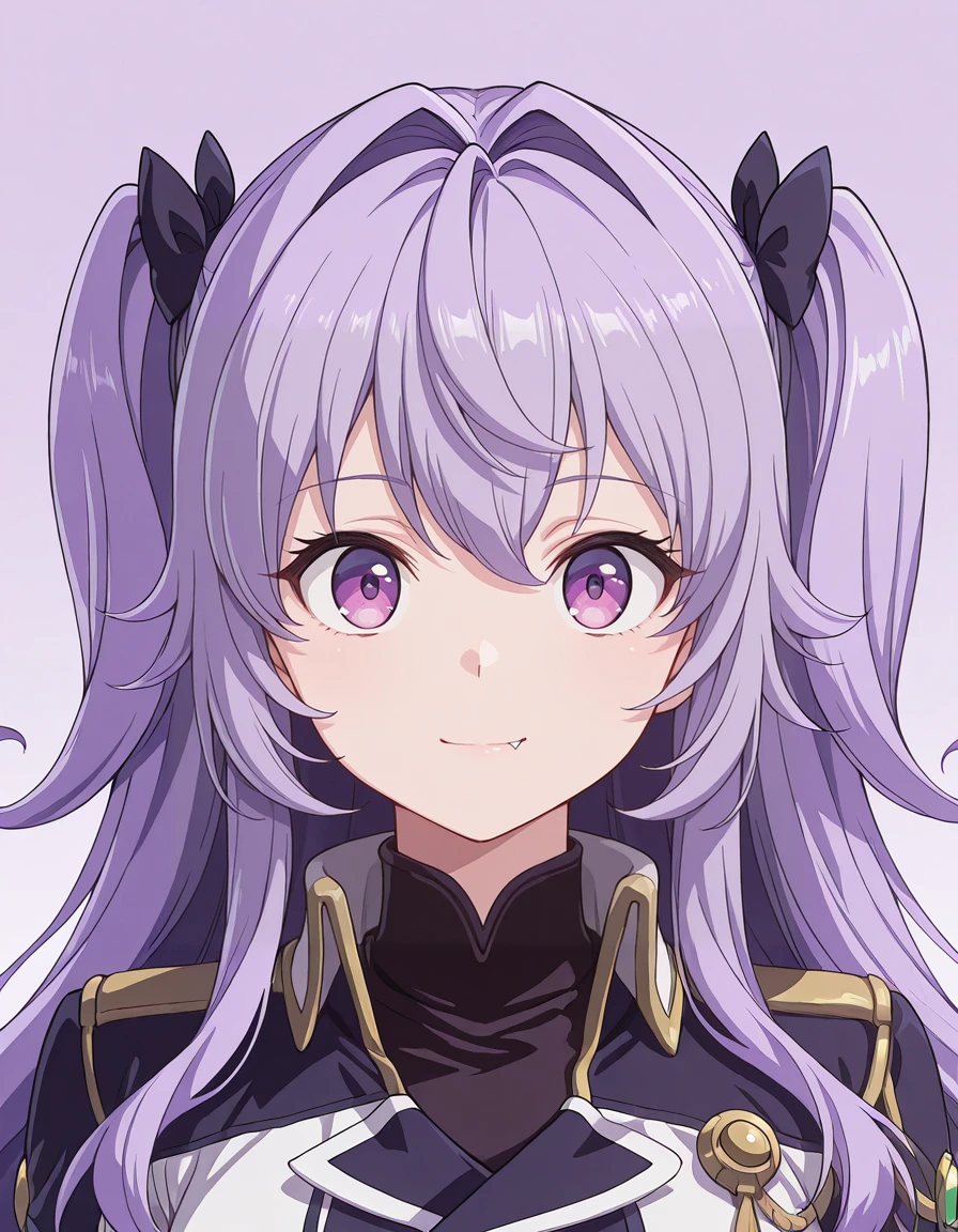 <lora:latticenail-ansatsusha_de_aru_s1-v2-ixl-anime-soralz:1>, latticenail (ansatsusha de aru), long hair, purple hair, twintails, hair ribbon, hair intakes, hair between eyes, sidelocks, purple eyes, fang
