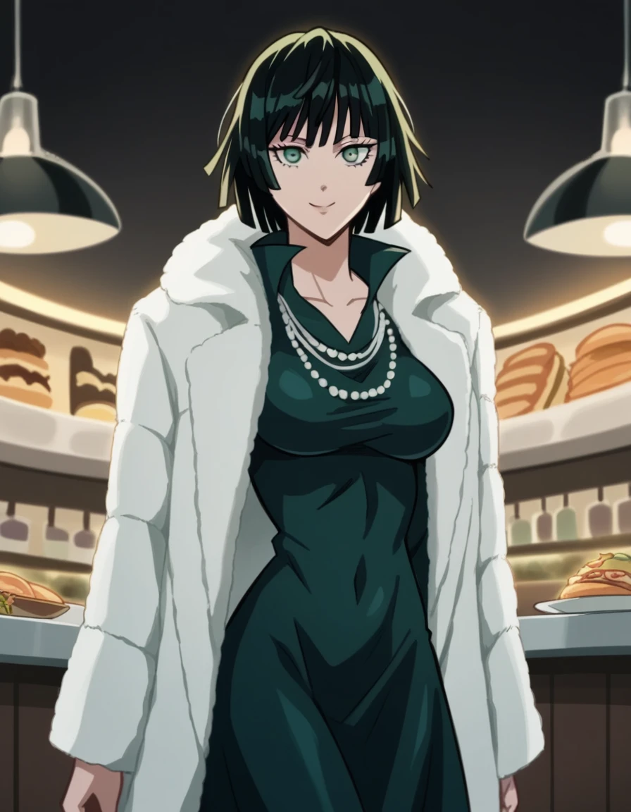 black dress, dress, fur coat, high collar, jewelry, necklace, off shoulder, taut clothes, taut dress,
