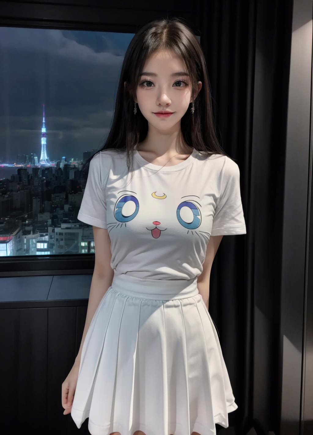 TAG:Cat T Shirt,white shirt,white skirt,navel,large ???????,