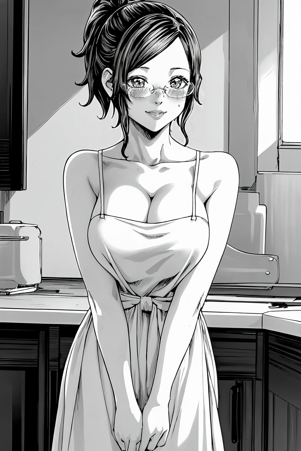 Optional : mature female, short hair, ponytail, bangs, sidelocks, glasses, rimless eyewear, lips