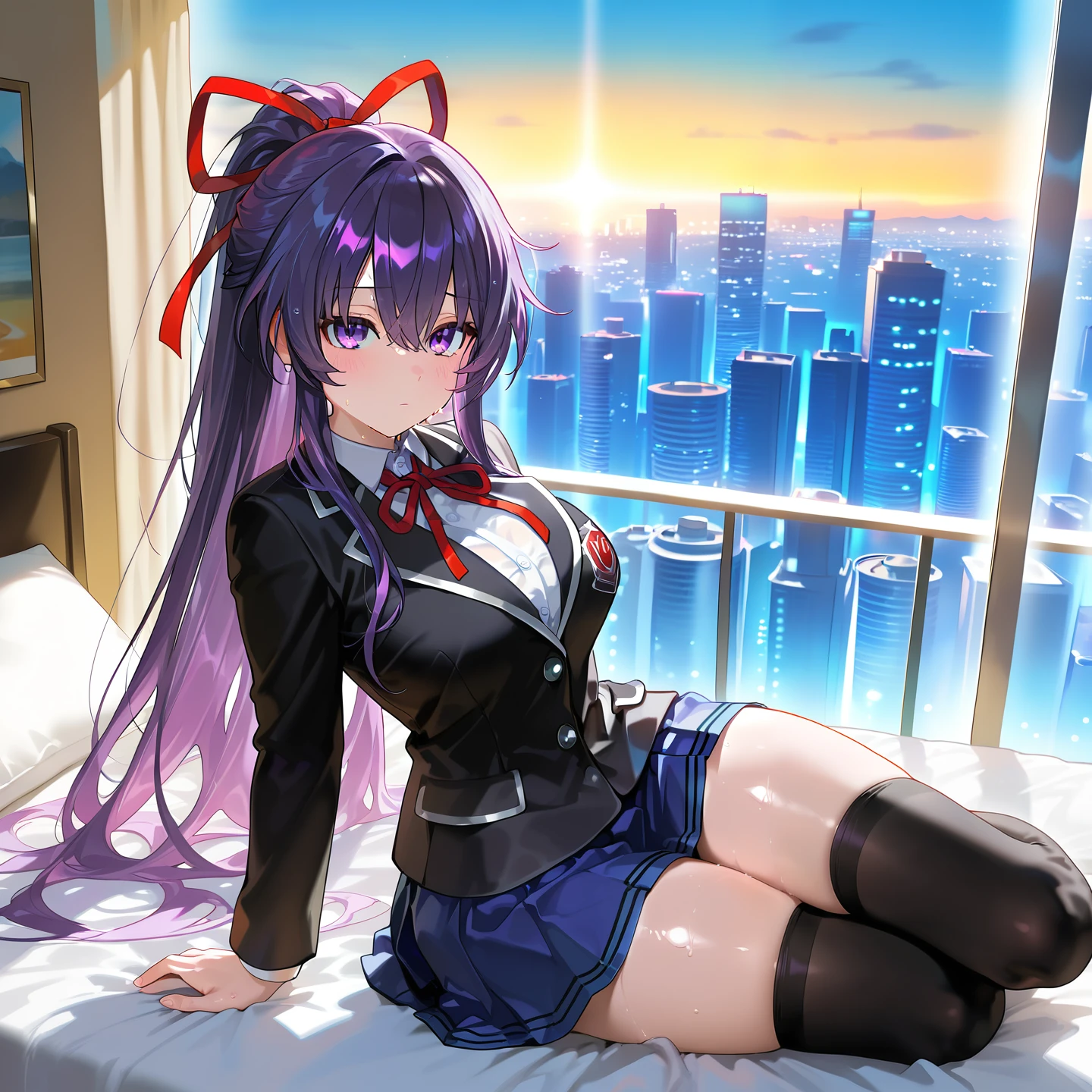 School Uniform prompts: DALTohka, DAL School Uniform, ???????, long hair, purple hair, hair bow, purple eyes, skirt, black thighhighs, jacket, school uniform, red ribbon, hair ribbon, blazer, white shirt, shirt, black jacket, blue skirt