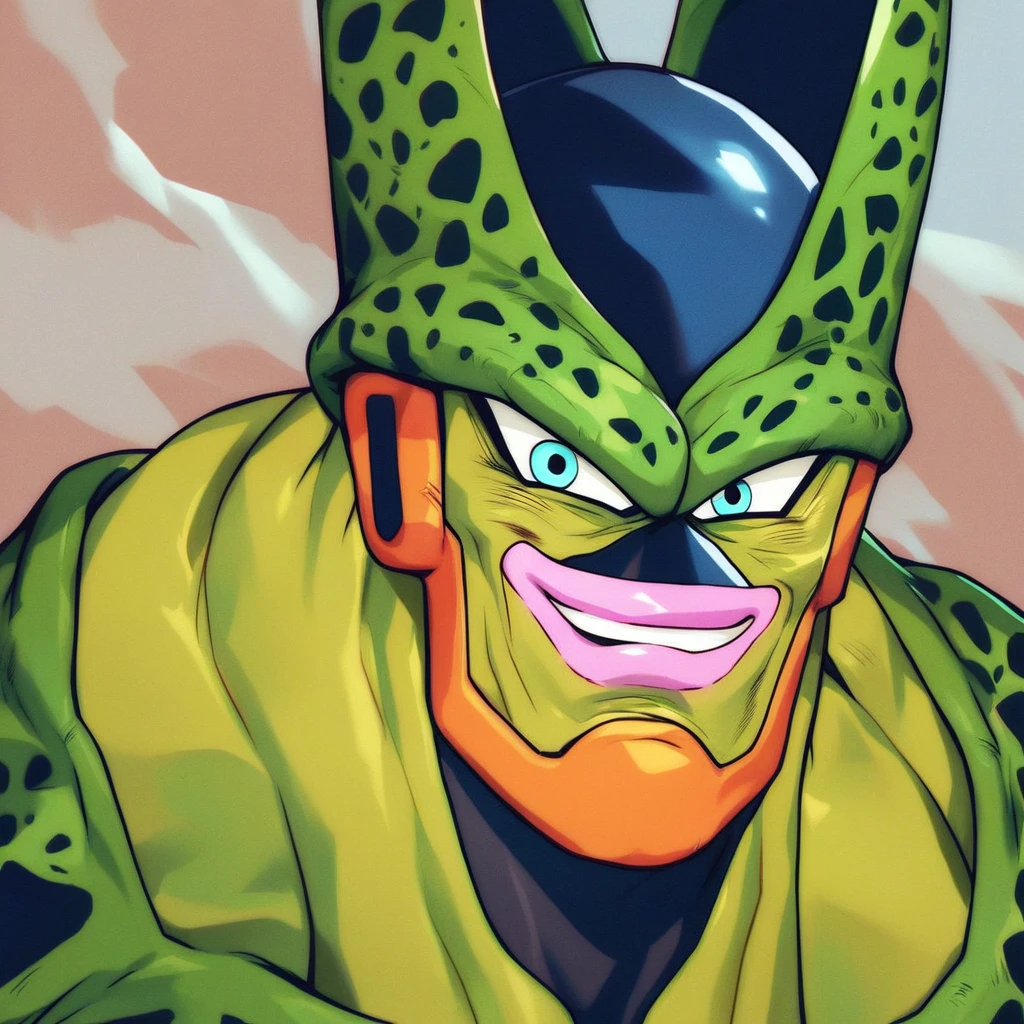 1boy, dbz_cell2nd, alien, pink lips, blue eyes, muscular, tail,