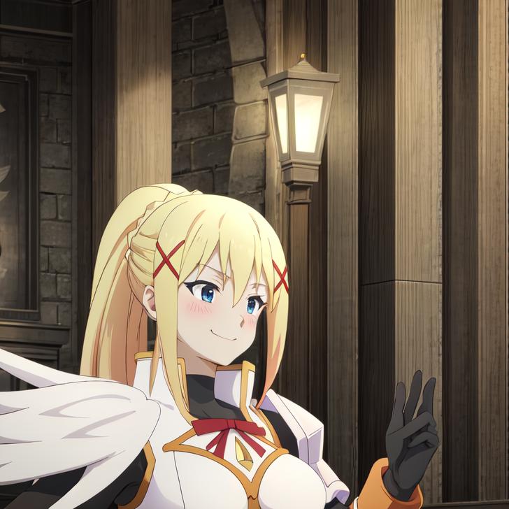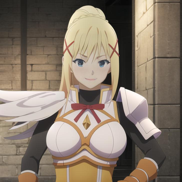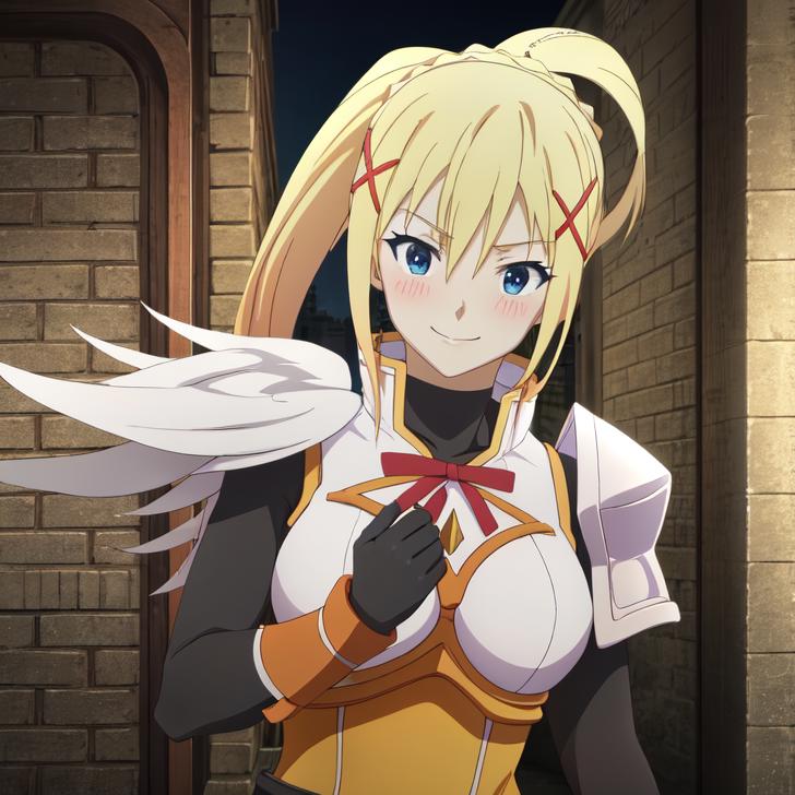 For main outfit, "x hair ornament, pauldrons, wings, shoulder armor, breastplate, ribbon, ????????, ponytail"