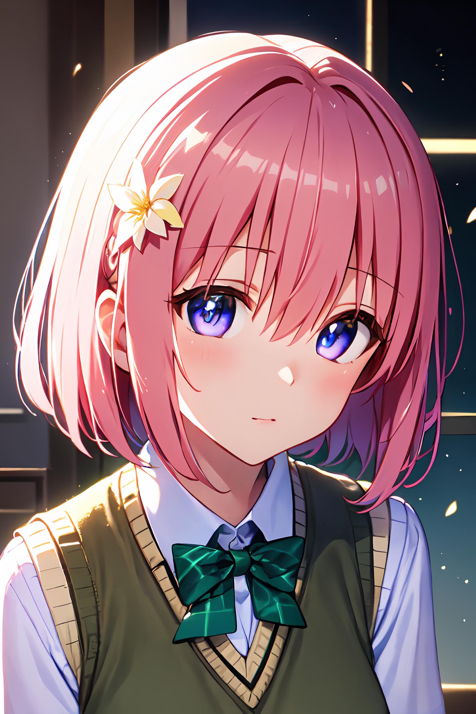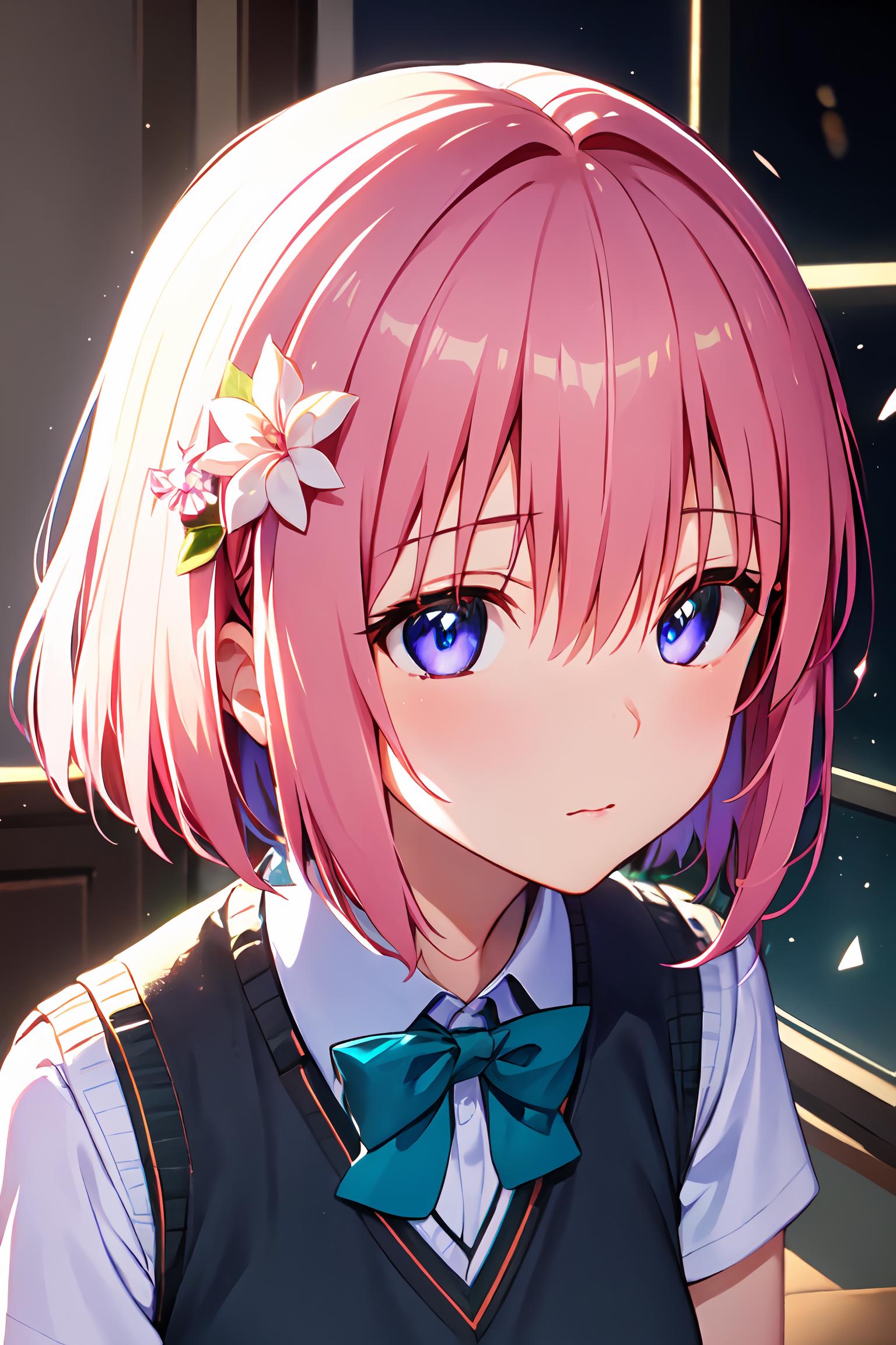 Full trigger words : ph momo, momohd, phmomo, solo, 1girl, pink hair, purple eyes, short hair, hair flower, sweater vest, school uniform,yellow sweater