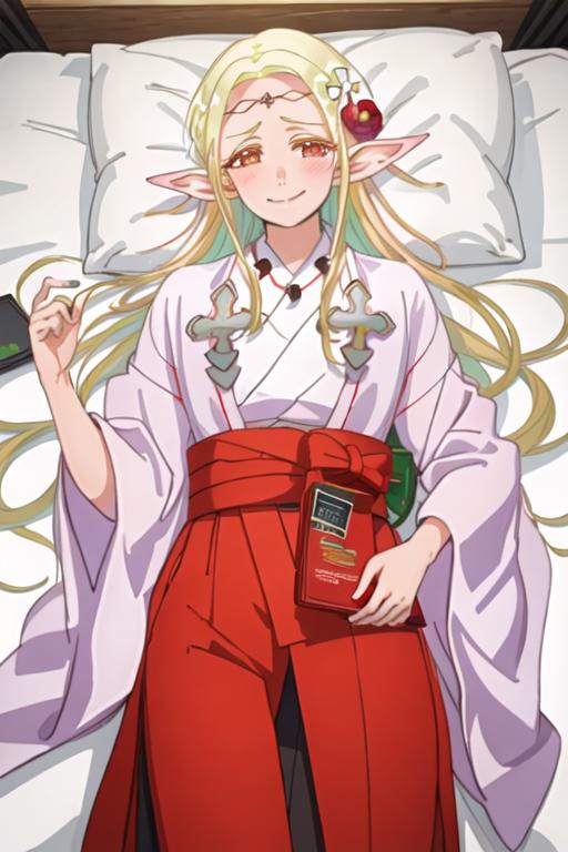 blonde_hair, pointy_ears, long_hair, elf, blush, circlet, hair_ornament, flower, hair_flower, red_eyes