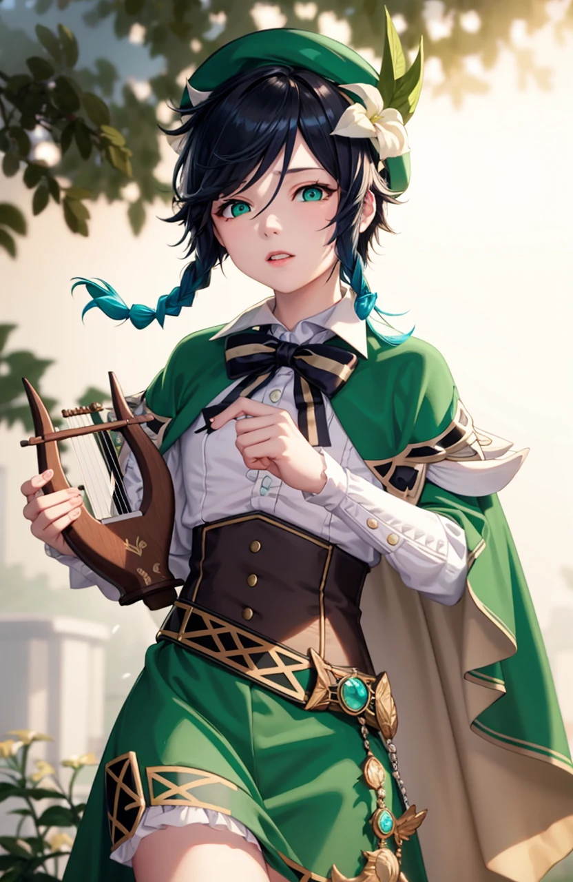 1boy, male focus, venti (genshin impact), lyre, black hair, hat, smile, braid, long sleeves, twin braids, gradient hair, multicolored hair, instrument, pantyhose, vision (genshin impact), bow, shorts, blue hair, green headwear, beret, white pantyhose, green shorts, collared cape, bangs, butterfly, holding instrument, white flower, shirt, jewelry, looking at viewer, white shirt, brooch, cape, androgynous, frilled sleeves, outdoors, frills, holding, leaf, corset, short hair with long locks