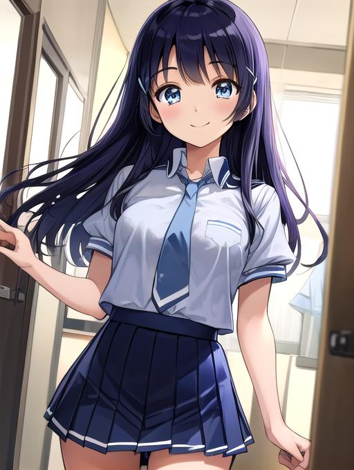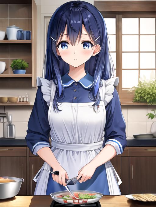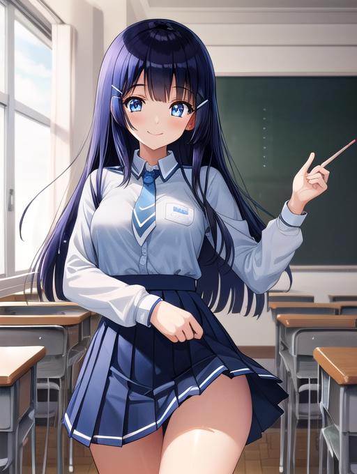 Additional words that may help: long hair, hair clips, blue eyes, blue hair