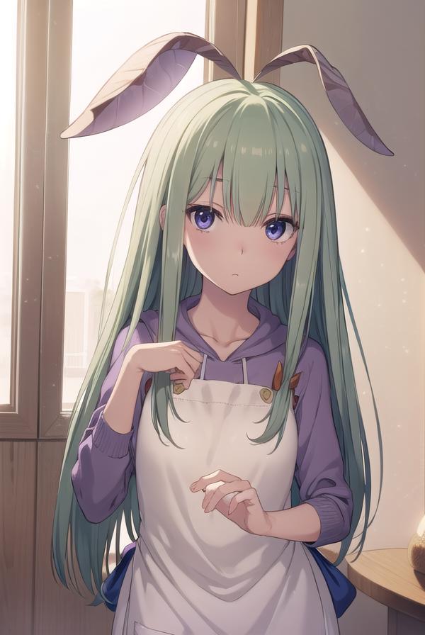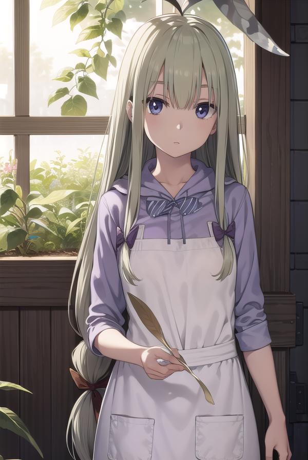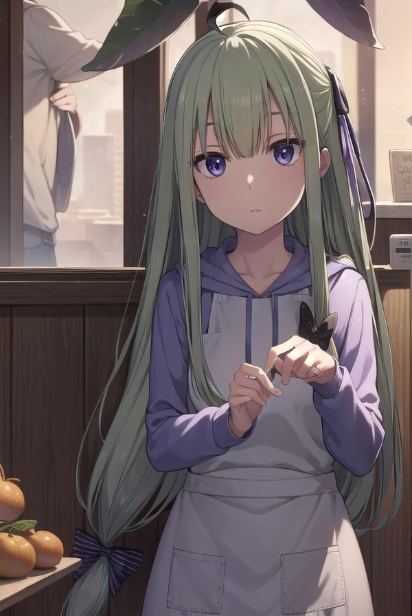 mandragora, long hair, bangs, ahoge, green hair, (purple eyes:1.1), bow, hair bow,