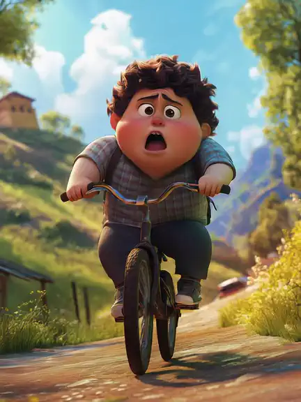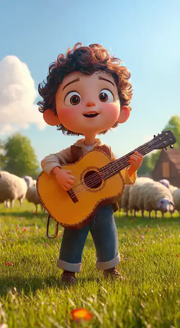 The young boy with a guitar plays on the grass, then infl4t3 inflates it, becoming an inflated cartoon figure strumming the guitar.