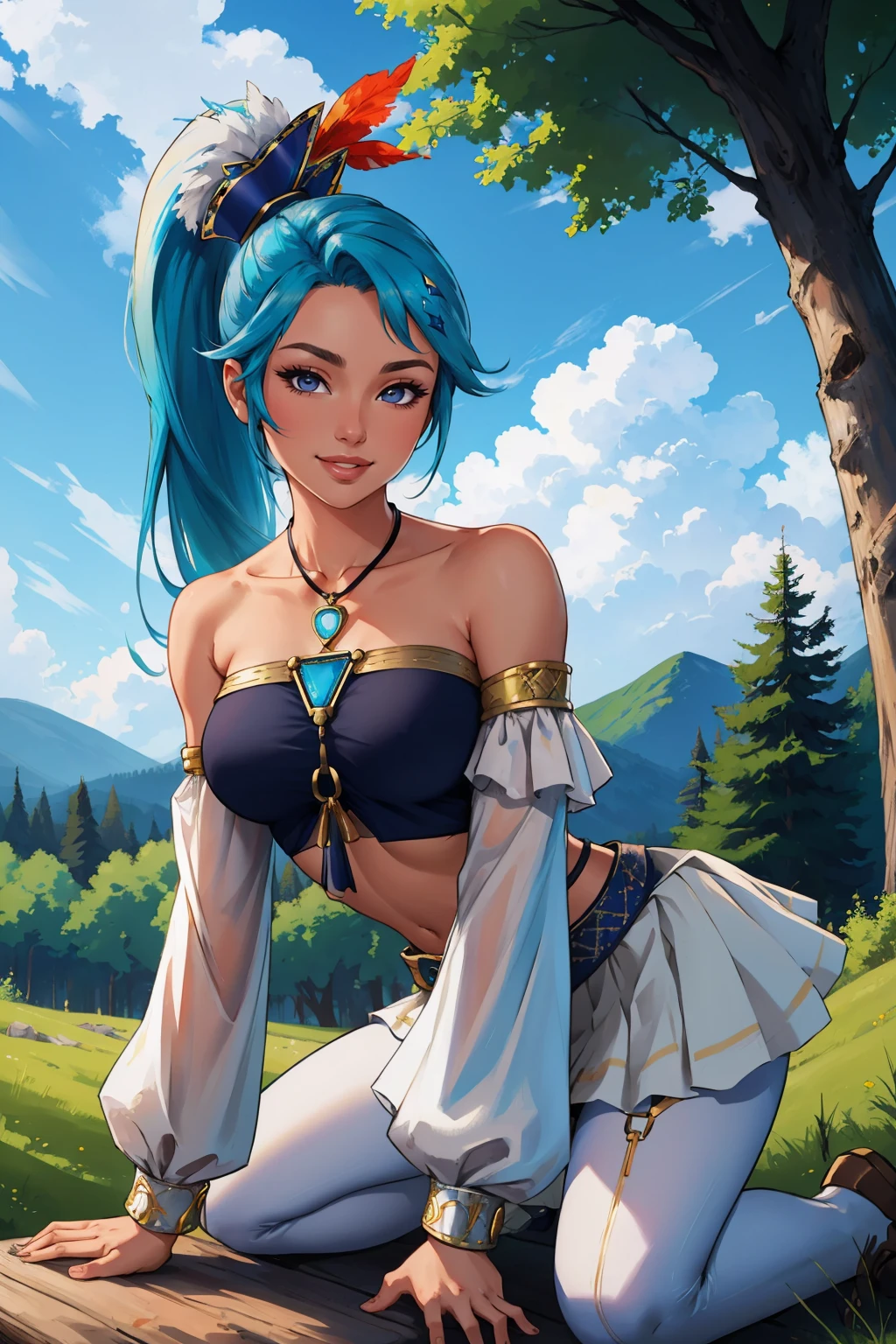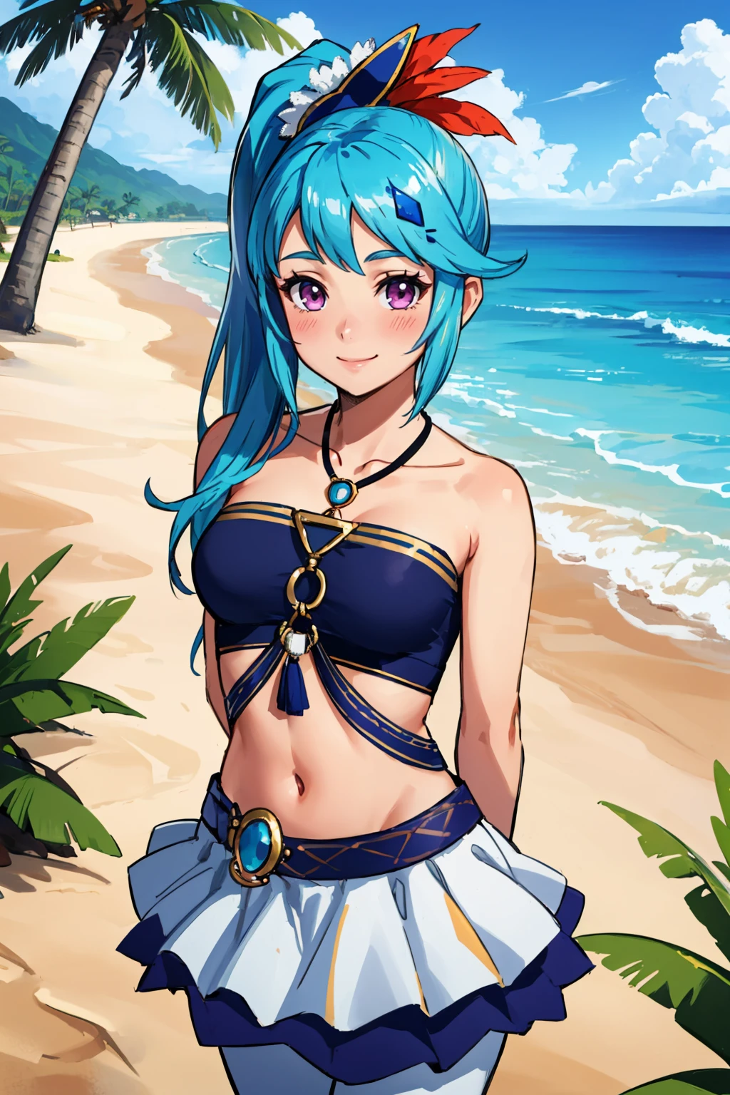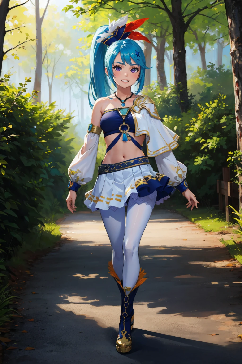 hair ornament, necklace, white capelet, detached sleeves, ???? shoulder, blue crop top, midriff, harness, belt, white skirt