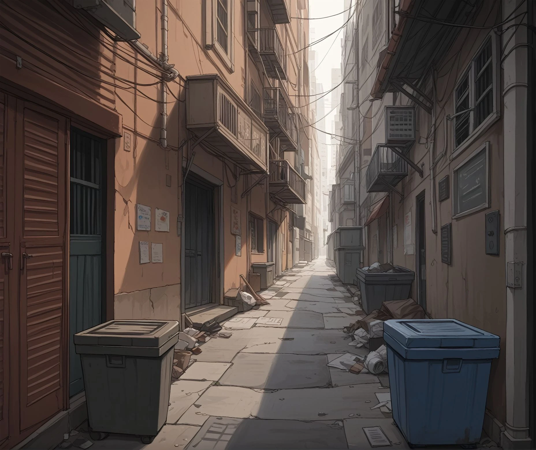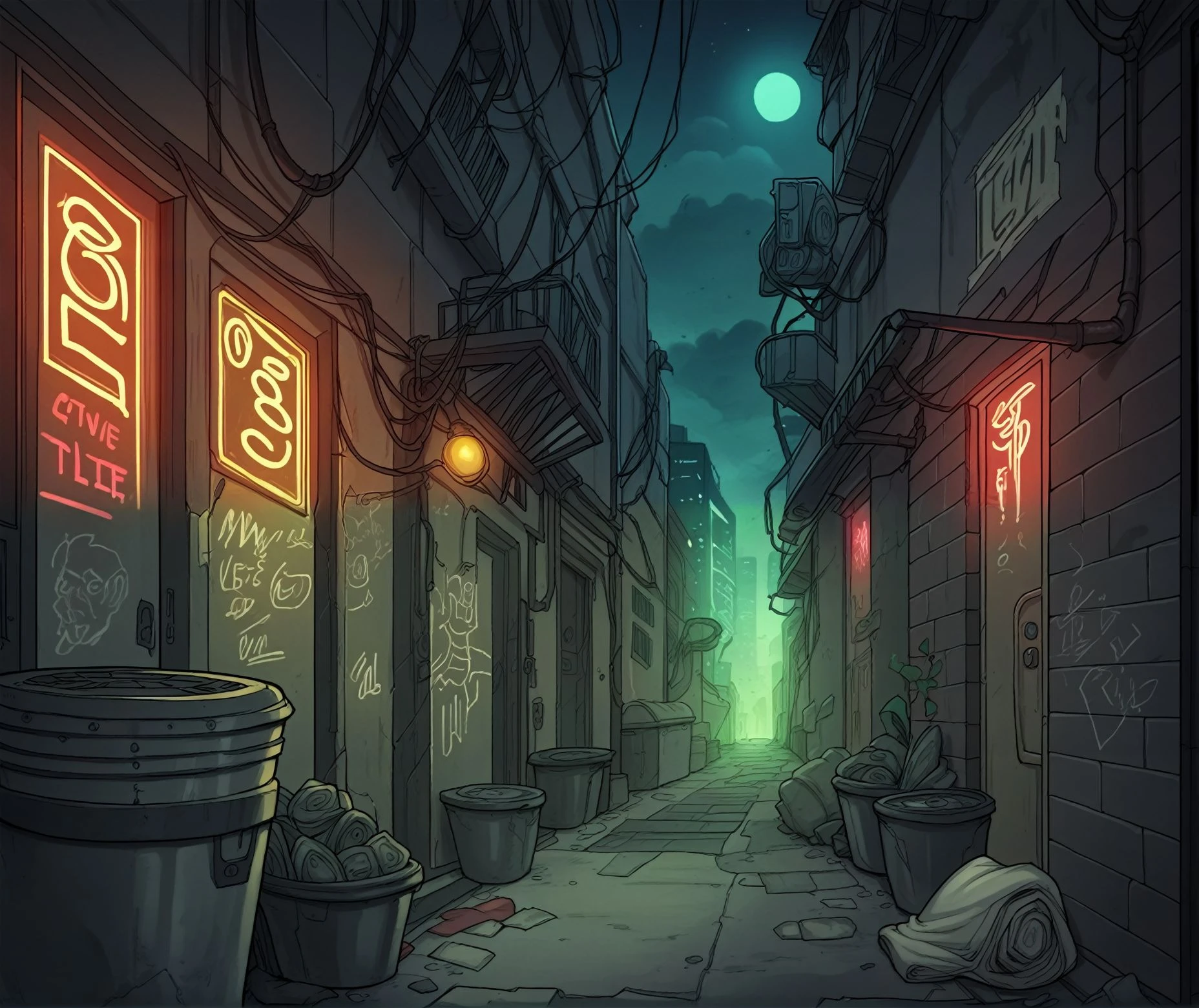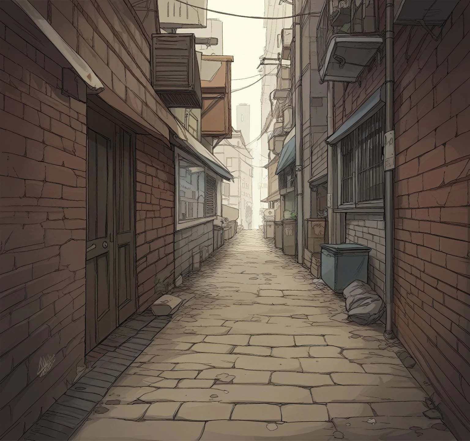 As for triggers, word alley tends to get a wider back alley and narrow alley more narrow one. Add to them other descriptive words like clutter, city, building, street, bicycle, outdoors, trash can, car, air conditioner, night, day, tree, plant, industrial pipe, power lines, cable, light, street lamp, sign, graffiti, poster, and so on...