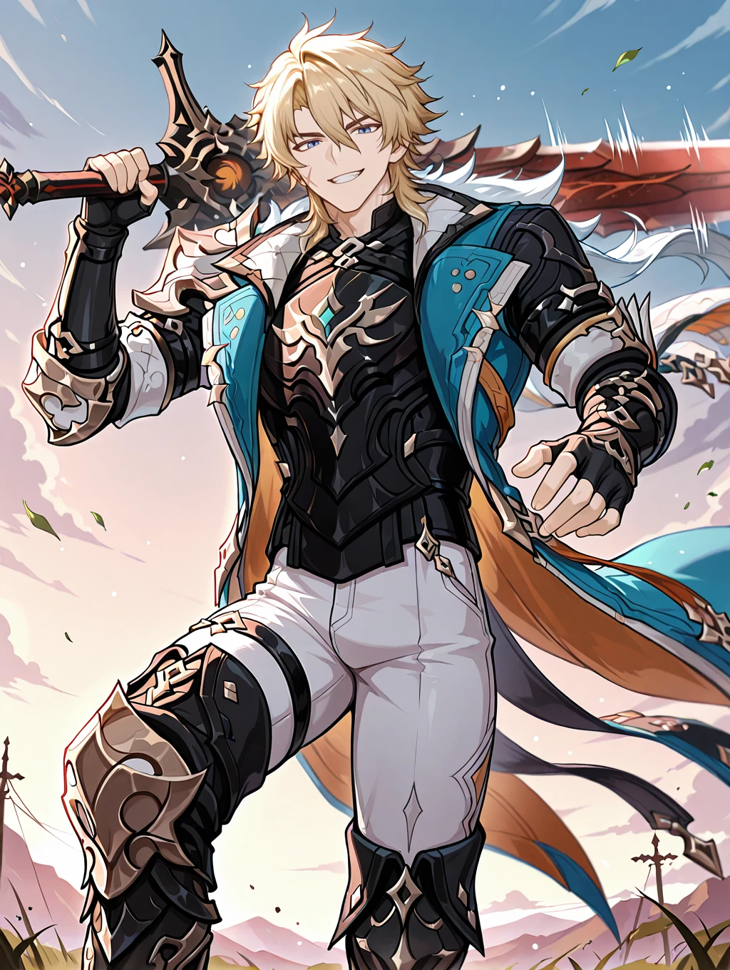 alternate costume, armor, breastplate, shoulder armor, fur-trimmed coat, multicolored coat, black coat, collared coat, blue coat, open coat, black gloves, fingerless gloves, white pants, armored boots, black bootsPost on TensorArt: https://tensor.art/models/888980350972226147?source_id=njuwoVDrnUe0rfcra3f88BUh