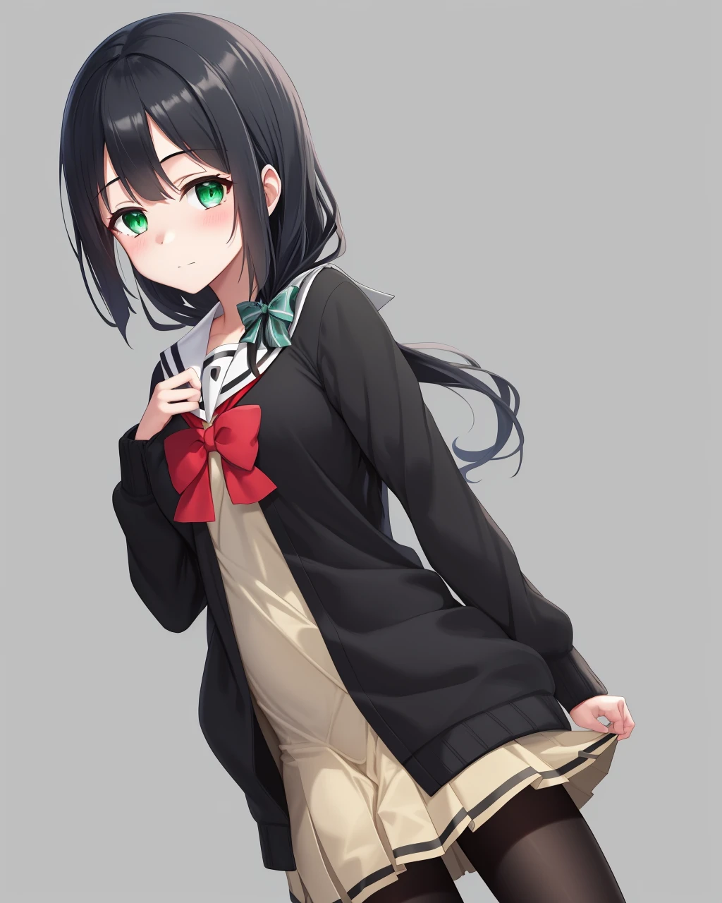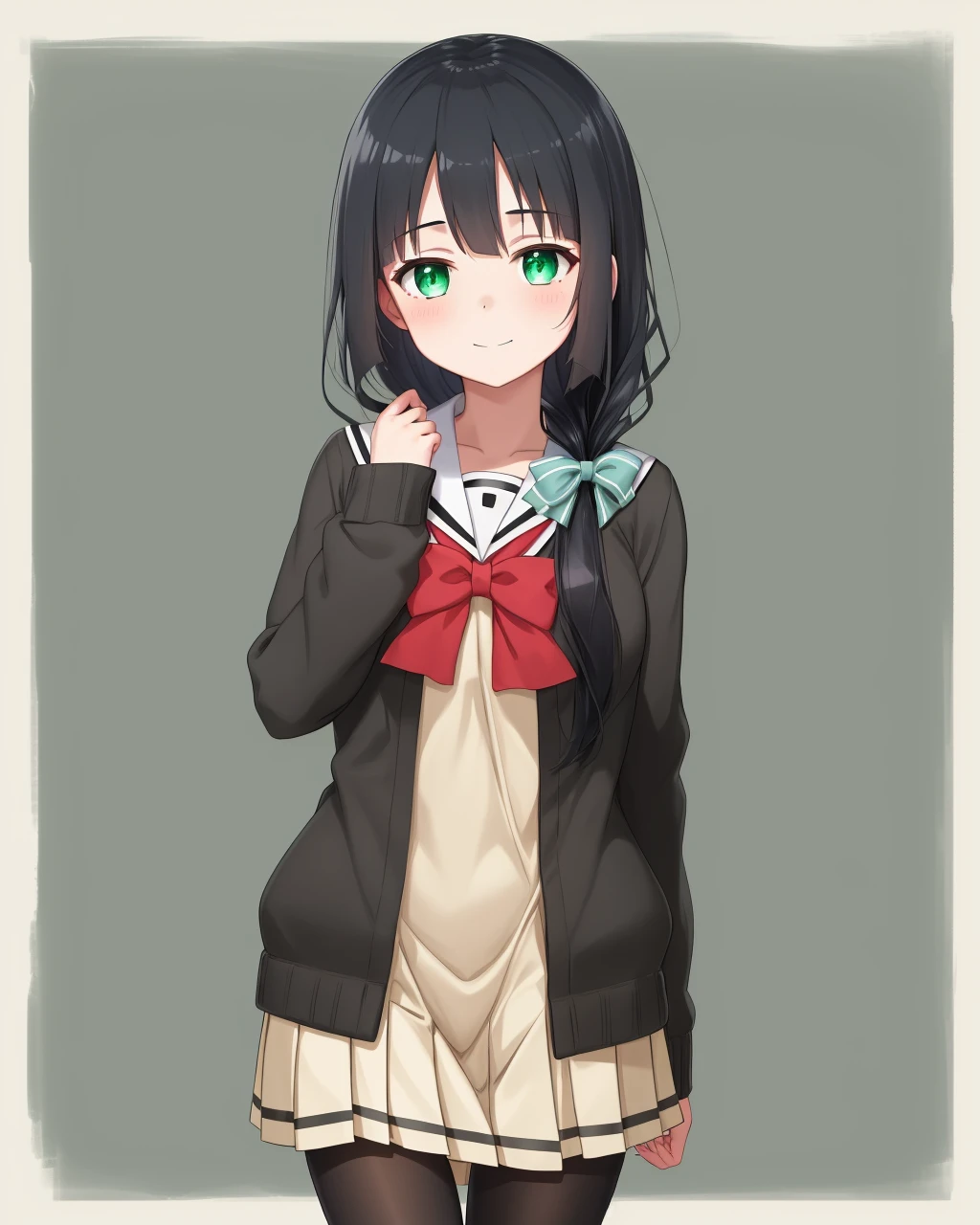 1girl, solo, long hair, black hair,green eyes,hair over shoulder, school uniform, black pantyhose, cardigan,dress, serafuku,