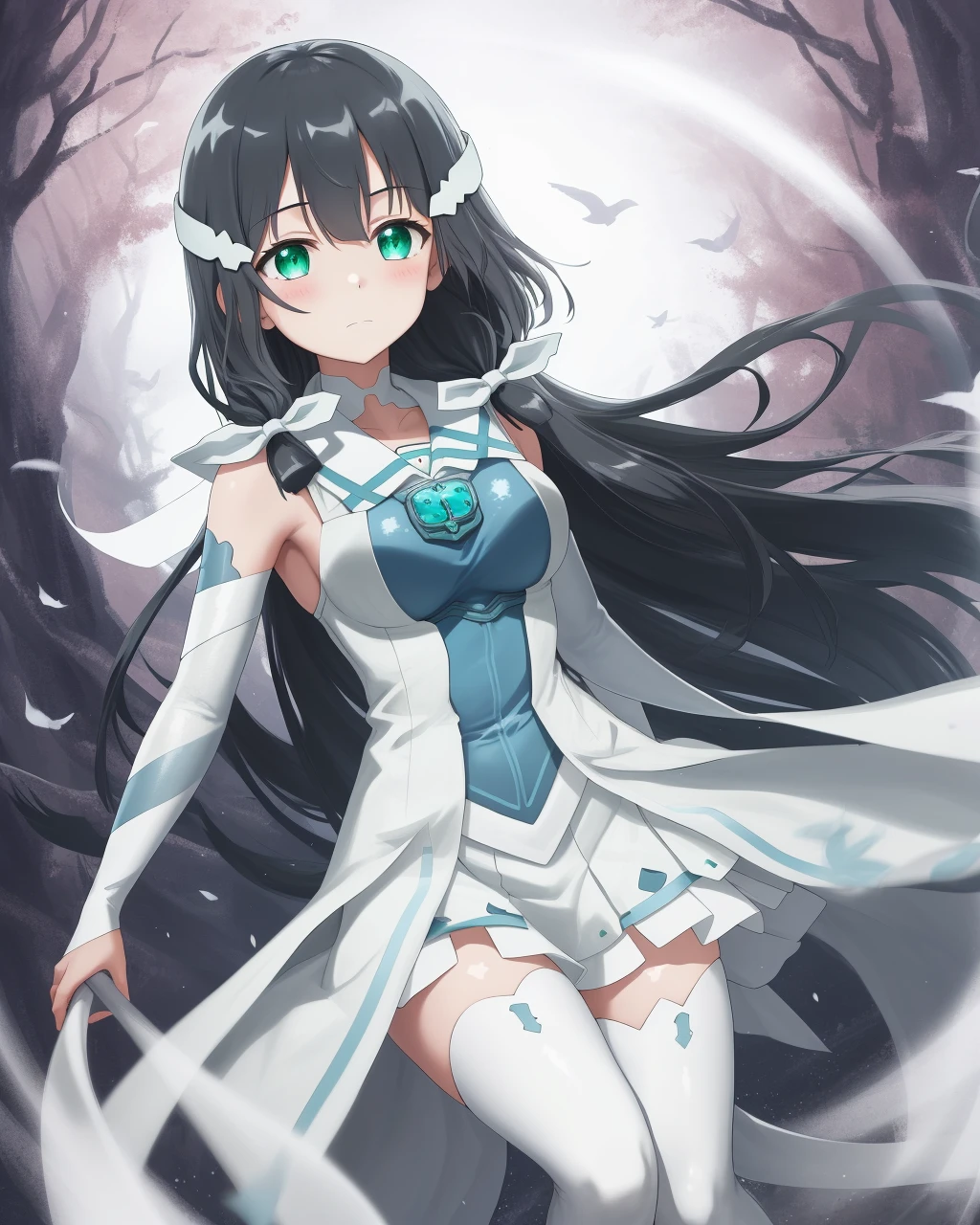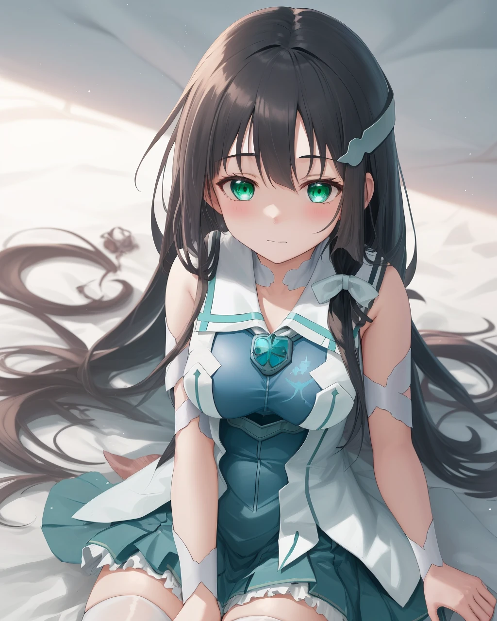 ,1girl, long hair, solo, black hair,green eyes,thighhighs,hair ribbon, magical girl, hair ornament ,