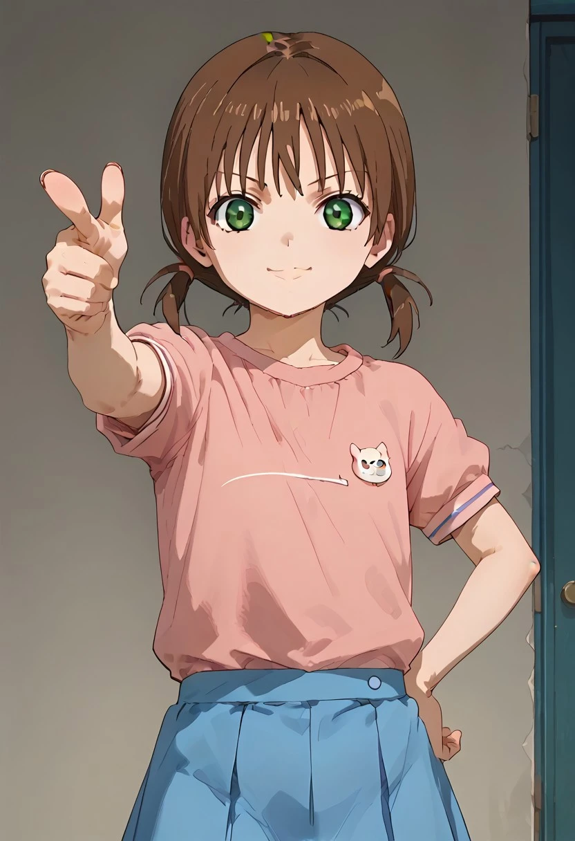 KristyDamonDSavers, 1girl, solo, green eyes, brown hair, skirt, twintails, blue skirt, pink shirt, short sleeves, short twintails, closed mouth, short hair, low twintails,Artistic Disclaimer: