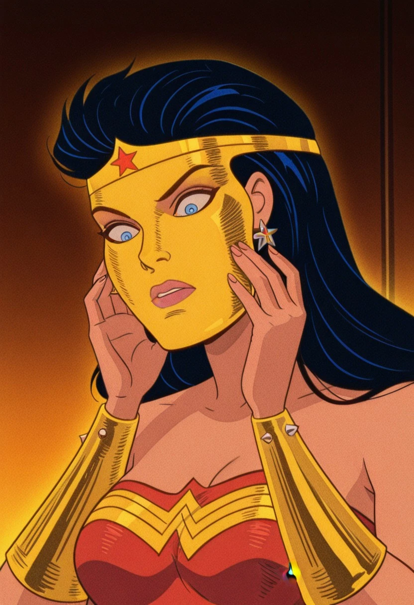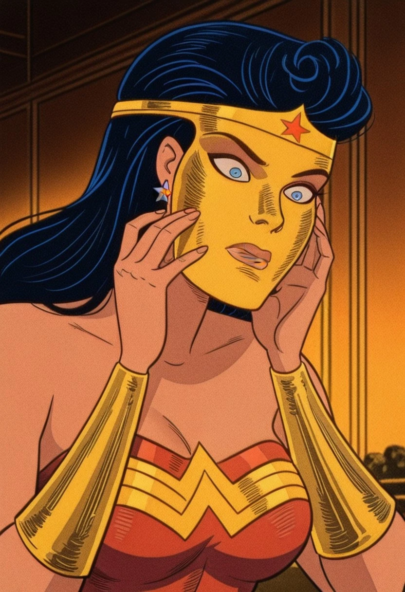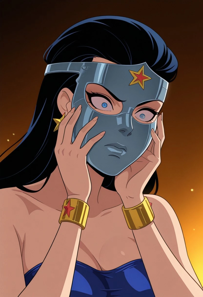 An agonizing metal mask from an early Wonder Woman story (it had a BOMB inside!!!), meant to replicate the sculpted face mask as a transferrable element in other styles and on other characters. Not sure if it will stay this version of Wonder Woman even though it's trained as a concept.