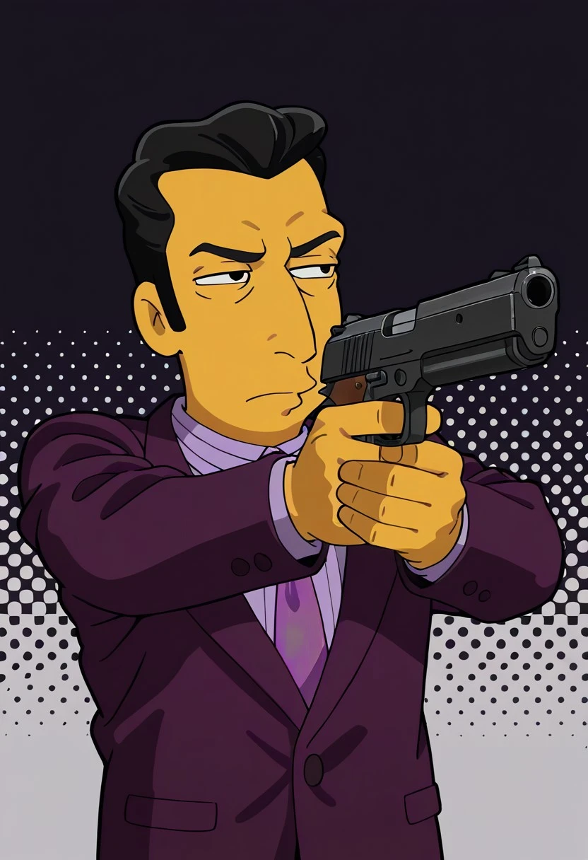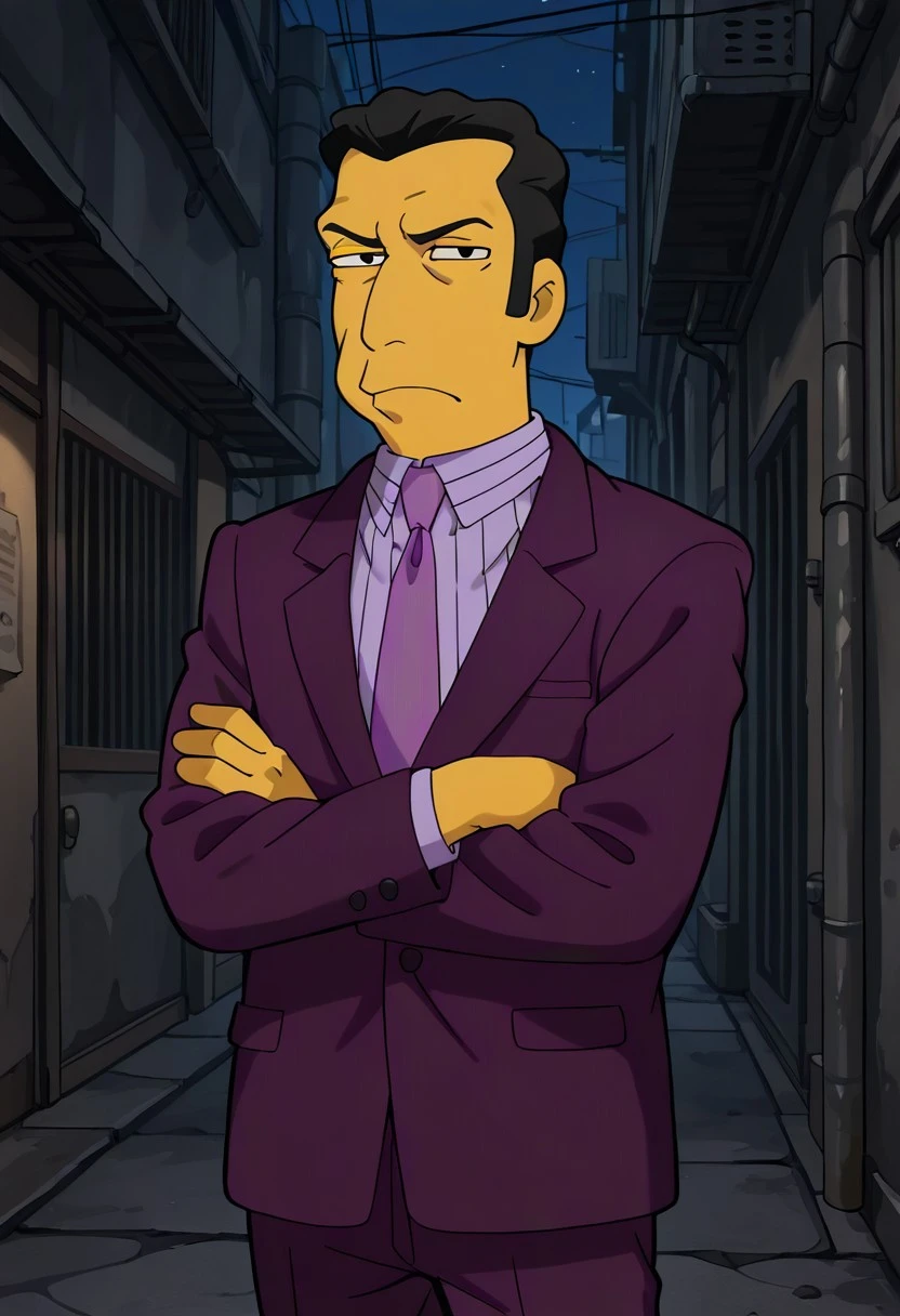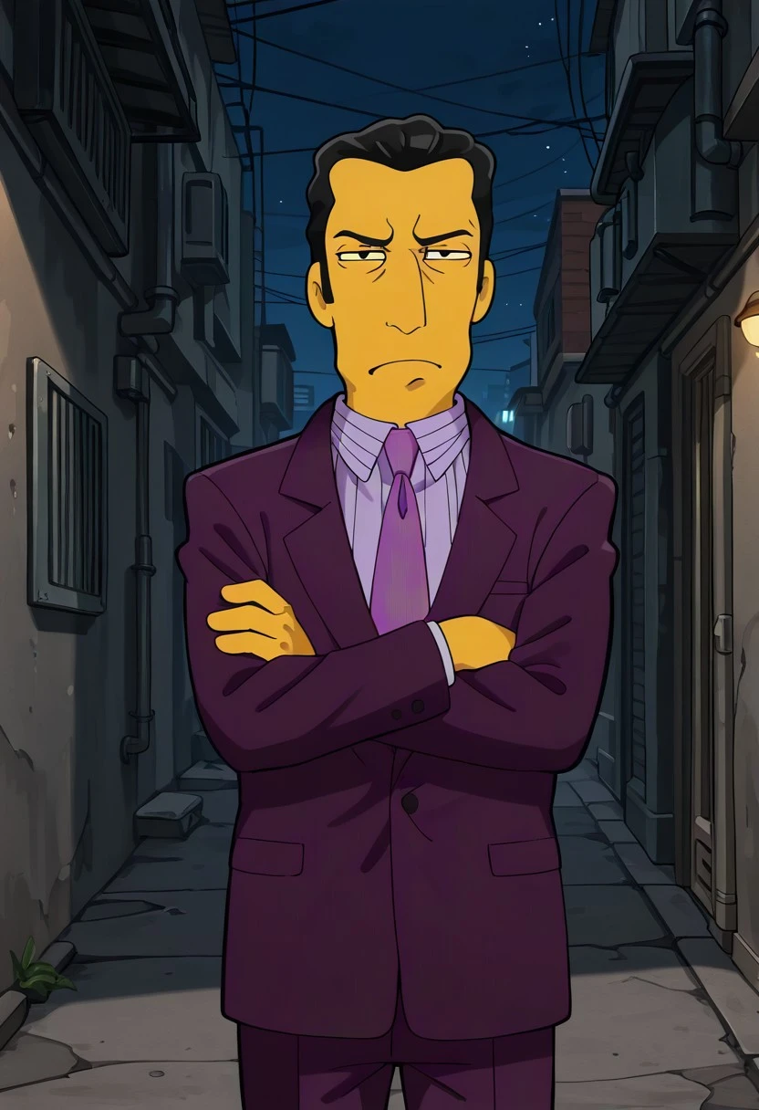 JohnnyTightlips, 1man, male, mature male, solo, yellow skin tone, medium build, black hair, black eyebrows, black eyes, dark purple coat, light purple collared shirt, purple necktie, dark purple dress pants, black dress shoes,