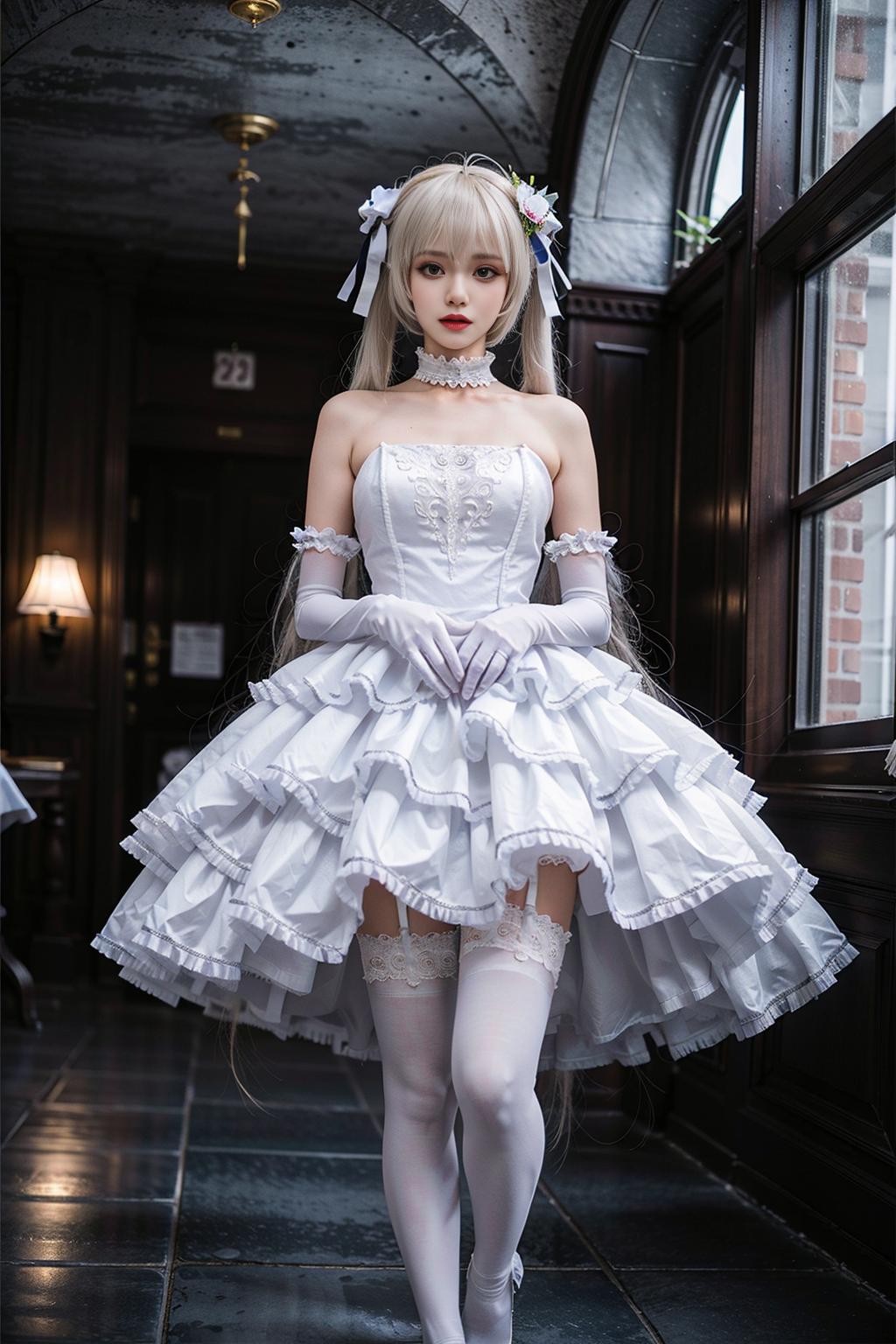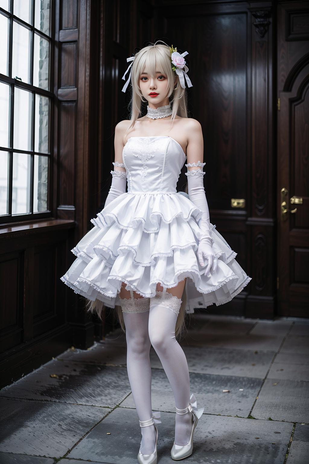 wedding attire, elbow gloves, wedding dress, thighhighs