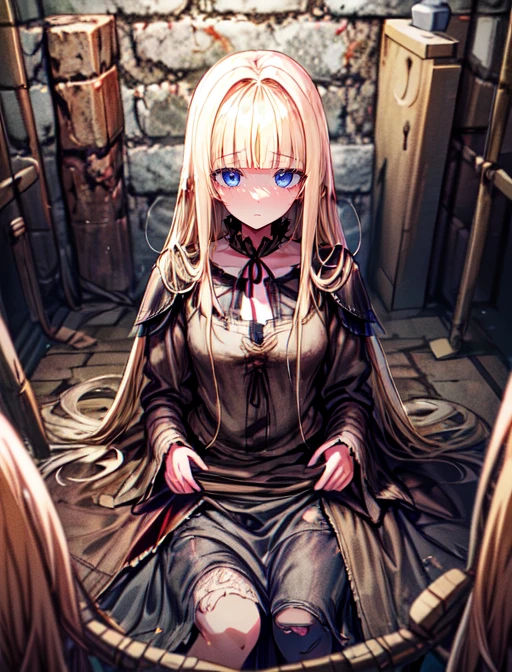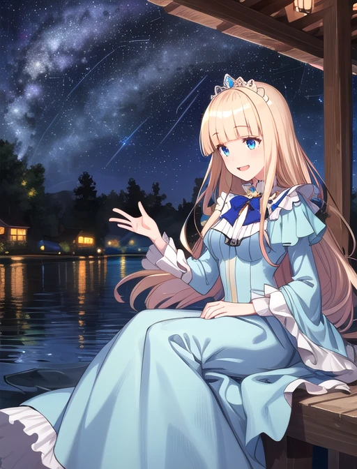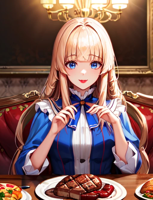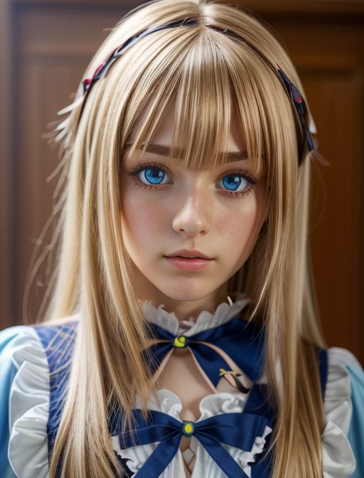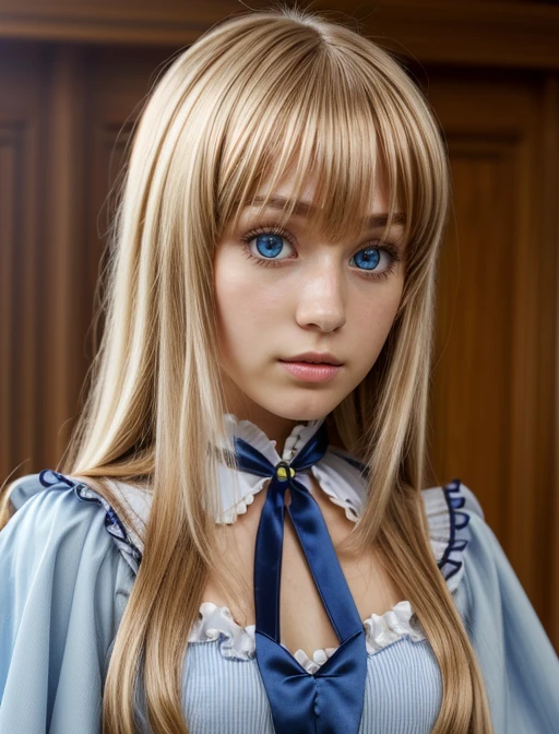 Additional words that may help: blue eyes, blonde hair, blunt bangs, long hair, lipstick,