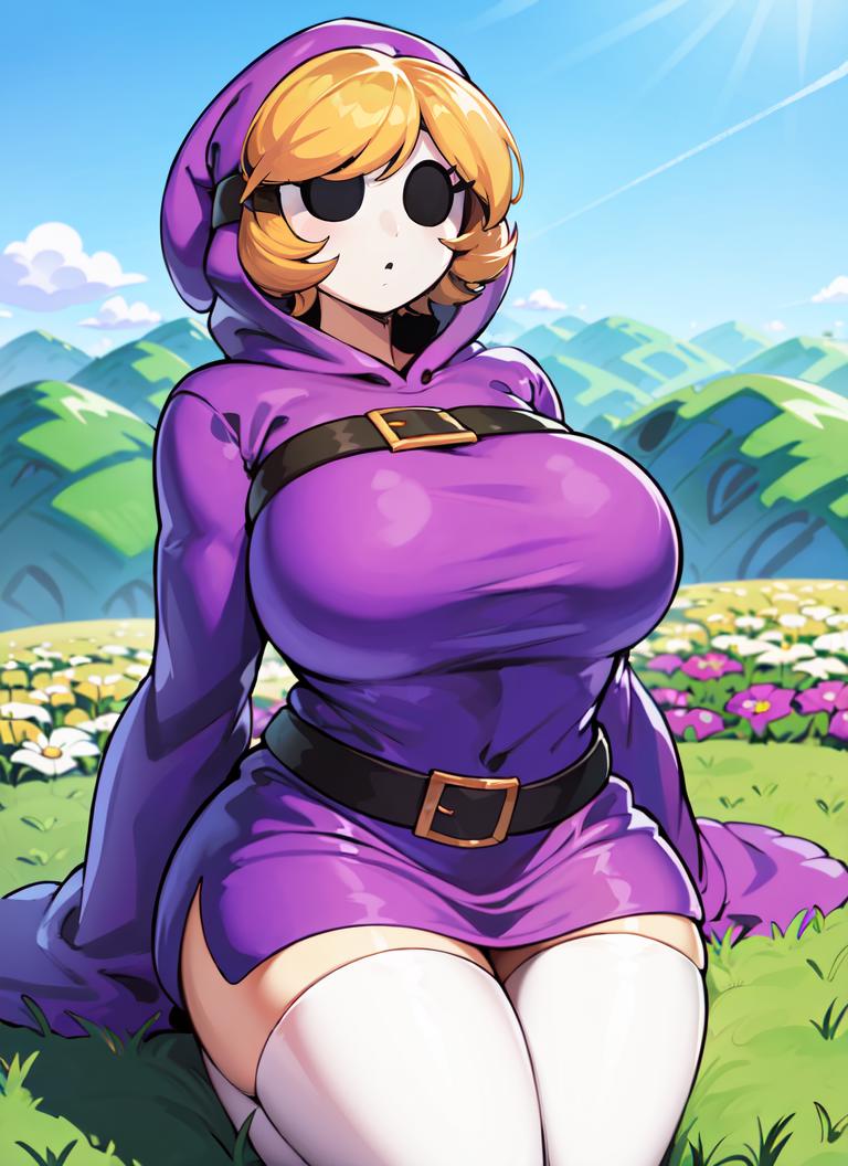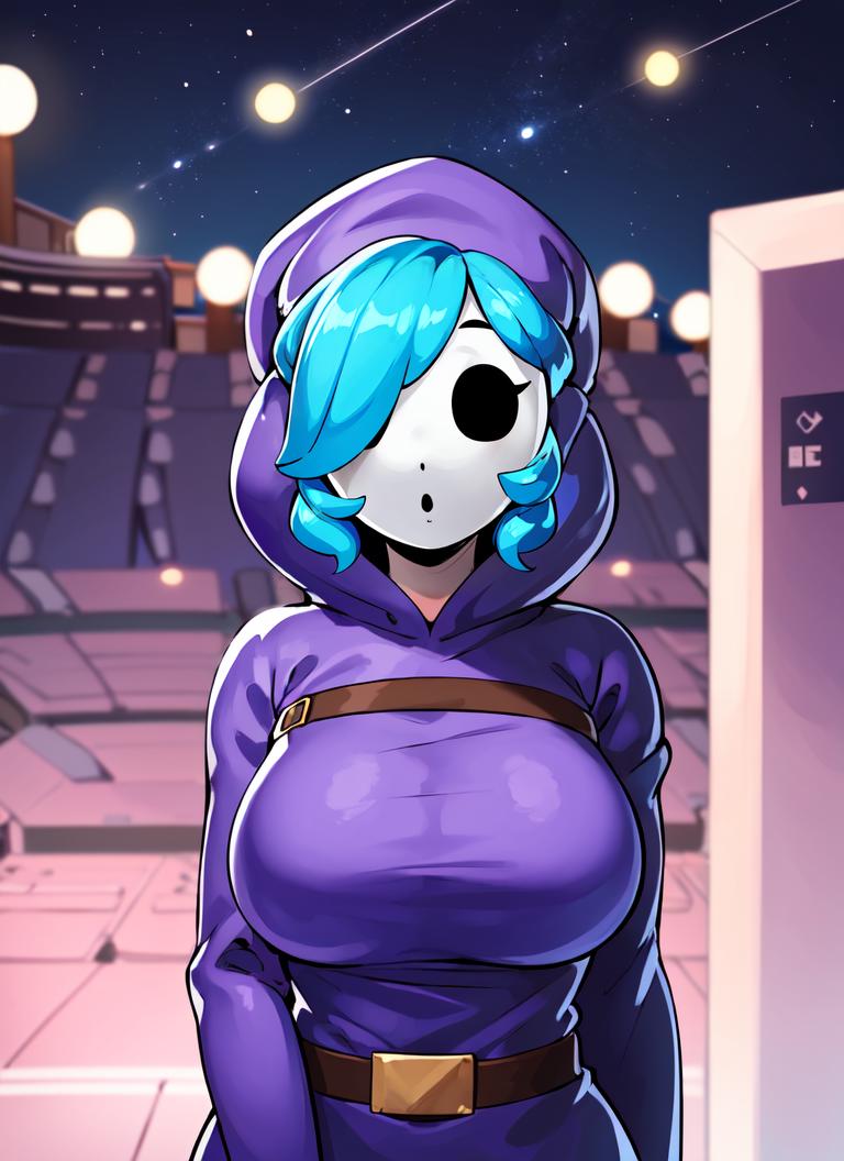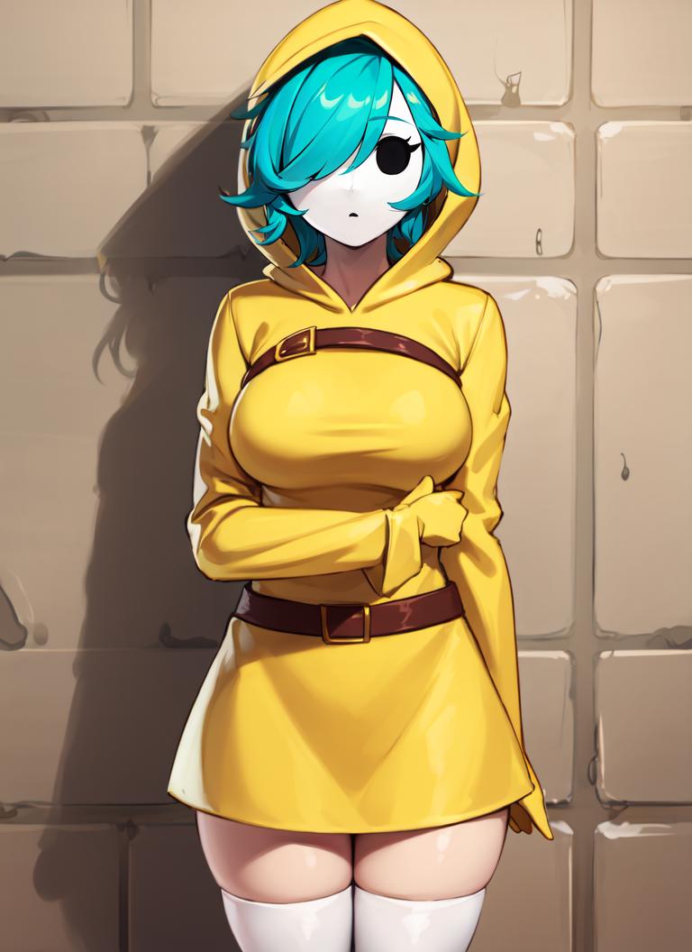 mask, eyelashes, sleeves past wrists, (round eyes, wide eyes), (faceless), black eyes, no nose, [[belt]], (<INSERT COLOR> hair, (<INSERT COLOR> hood), <INSERT COLOR> skirt, hood, <INSERT COLOR, WHITE WORKS BEST> thighhighs, <OPTIONAL> garter belt, garter straps)