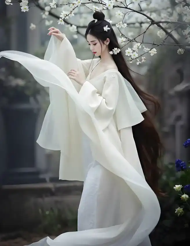 bs567, a woman in a flowing white Hanfu dress, standing under a blossoming tree, transforms into a Tyrannosaurus Rex with a morphing light effect, the camera follows the action.