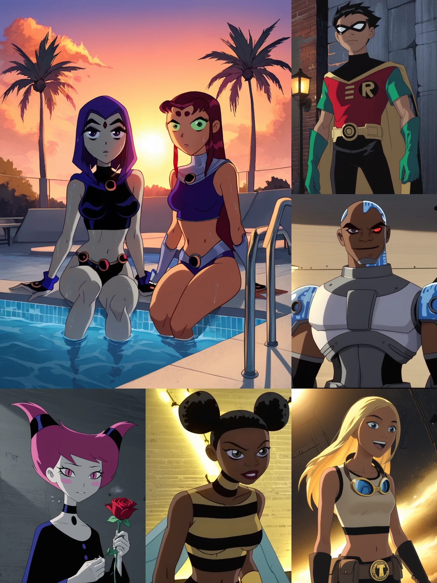 This LoRA is trained on screenshots from the Teen Titans TV series (2003–2006), capturing the animation style and distinctive characters of the beloved show. The animation, known for its vibrant colors, bold lines, and expressive character designs, brings to life the adventures of Robin, Starfire, Raven, Beast Boy, and Cyborg. This model can recreate both the energetic action scenes and the unique, stylized look that define the series.