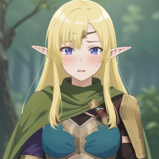 (masterpiece, best quality:1.2),illustration,8k,hd,1girl,solo,upper body,(portrait:1.2),long_hair,breasts,blush,bangs,blue_eyes,blonde_hair,purple_eyes,skirt,pointy_ears,cape,armor,elf,circlet,belt,white_gloves,<lora:Elf-V1:0.6>,