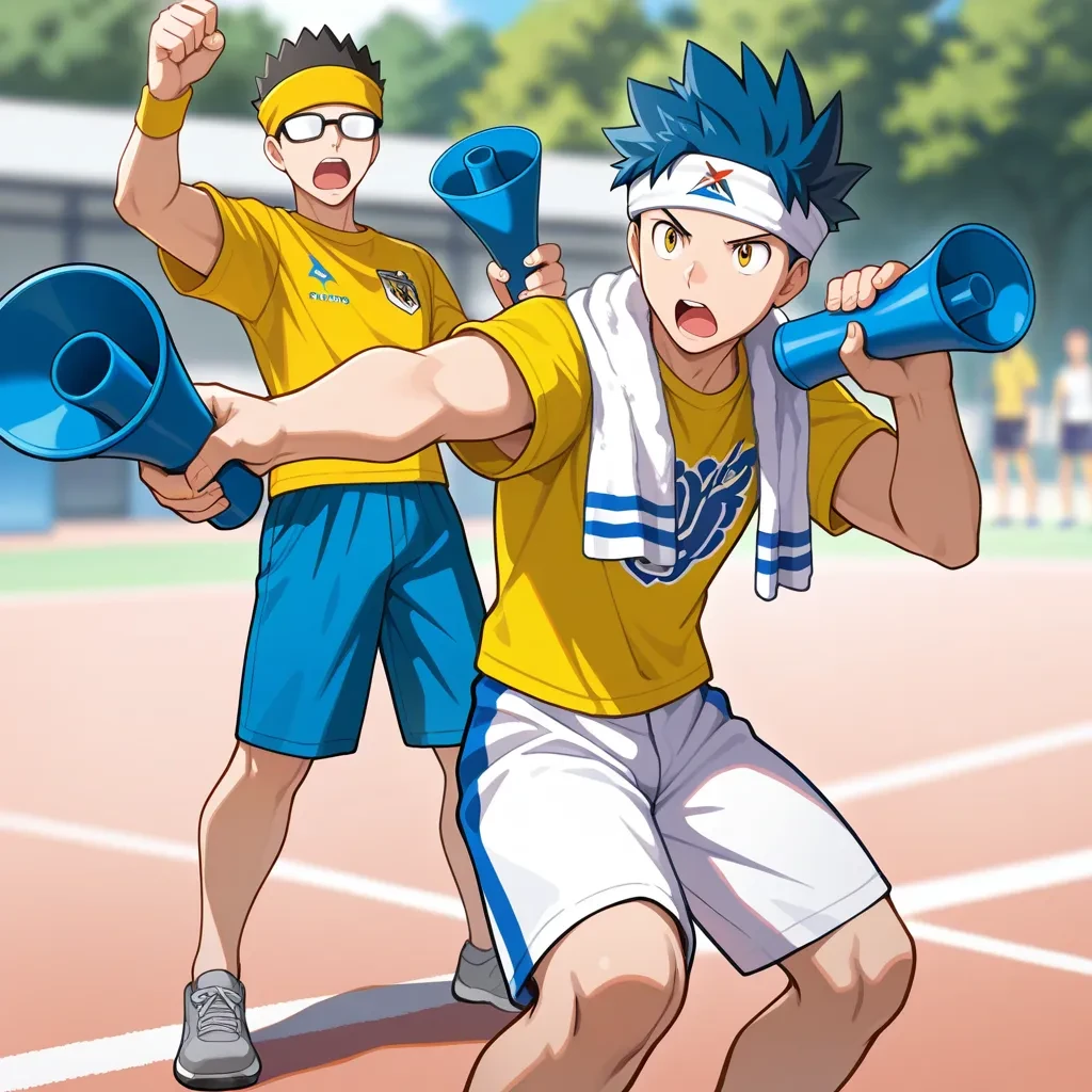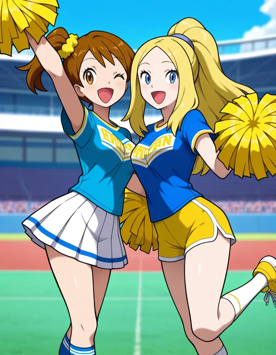 blpn,blonde hair,long hair,high ponytail,parted bangs,tsurime,blue shirt,print shirt,short sleeves,yellow shorts,short shorts,white socks,kneehighs,blue footwear,two-tone footwear,yellow pom pom (cheerleading),holding pom poms,cheerleader,