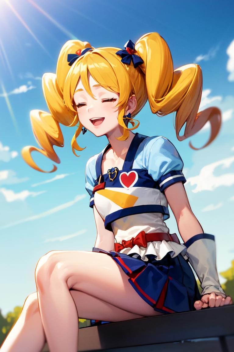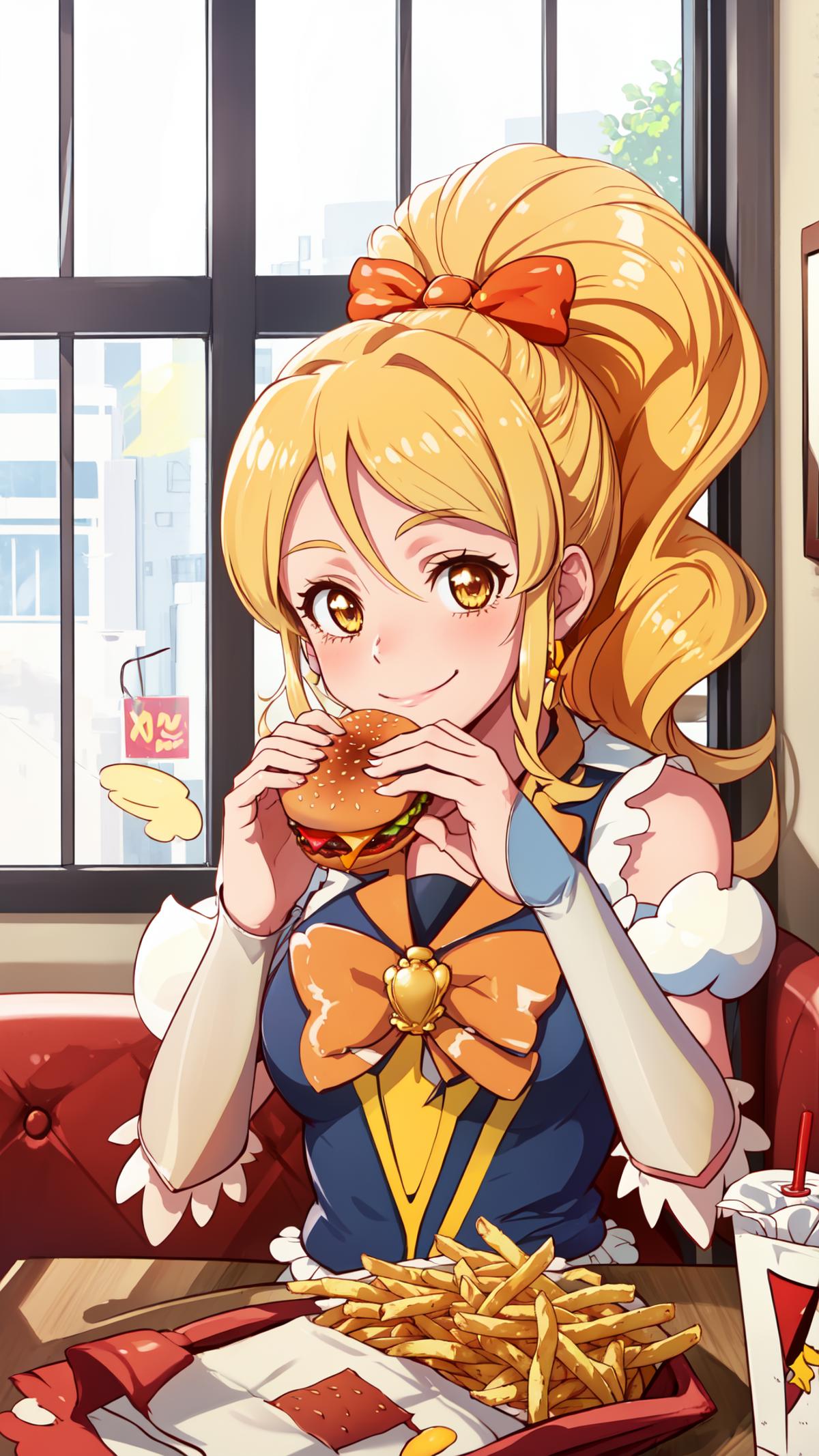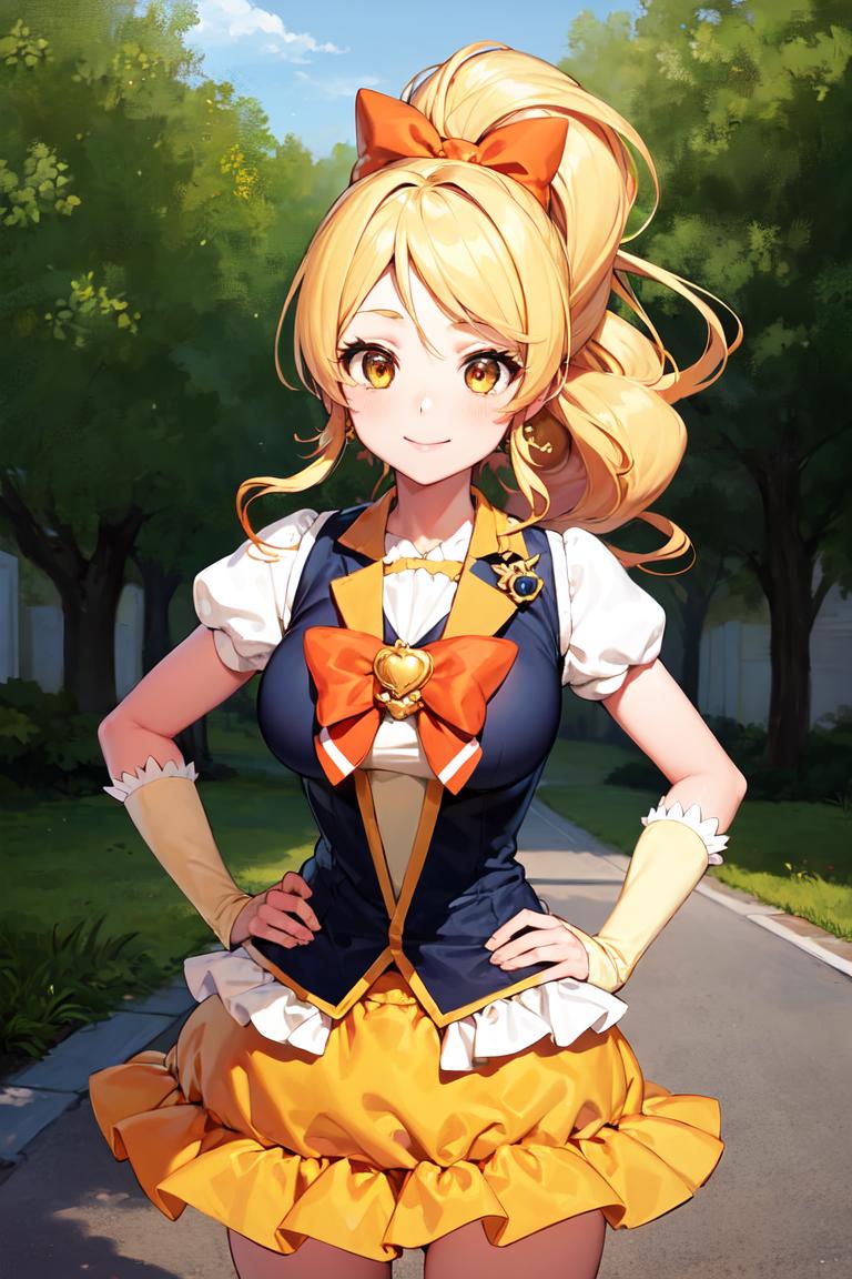 "cureHoney, blonde hair, ponytail, bow, brooch, yellow skirt, vest, puffy sleeves, wrist cuffs"