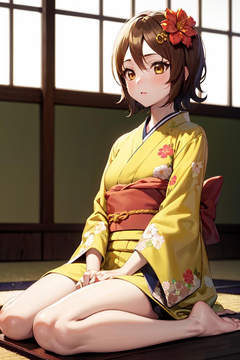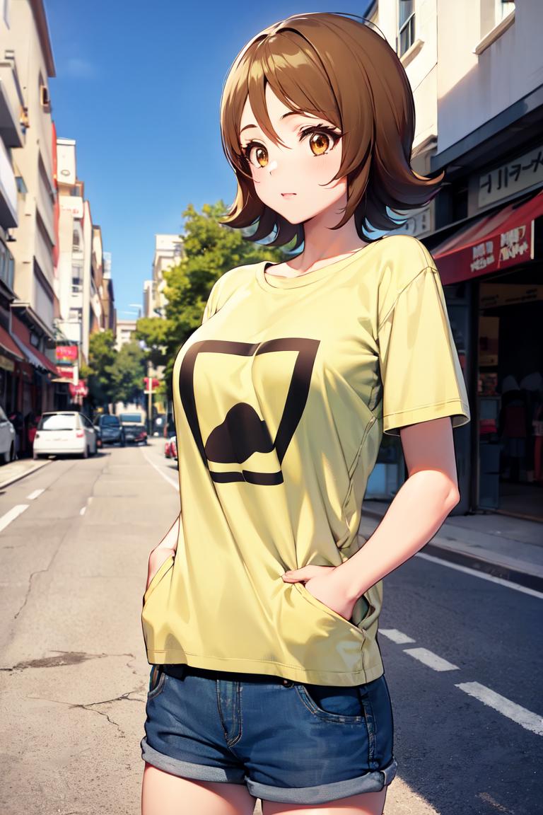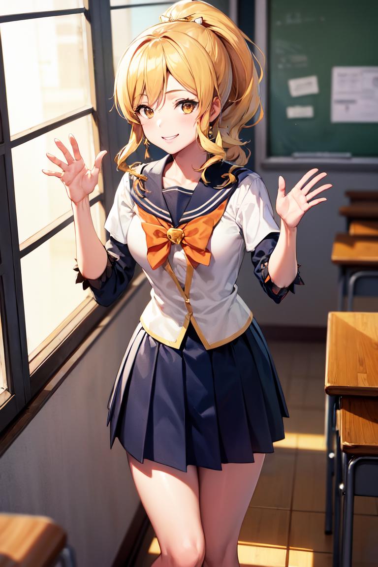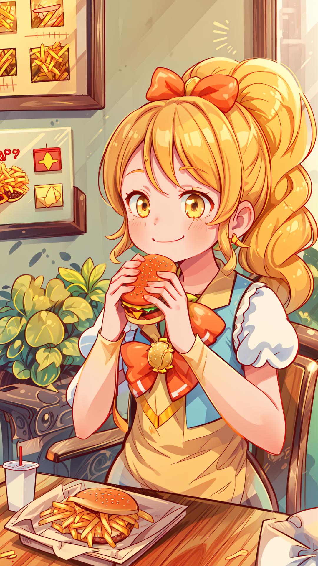 "cureHoney, blonde hair, ponytail, bow, brooch, yellow skirt, vest, puffy sleeves, wrist cuffs"