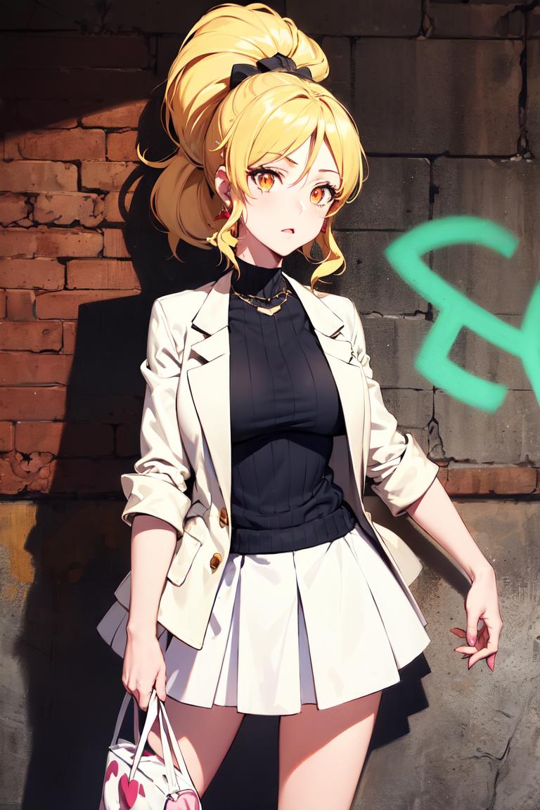 "popcornCheer, blonde hair, twintails, hair ornament, jewelry, multicolored clothes, multicolored skirt, waist bow"