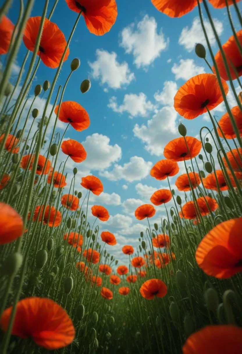 TEMPLATE EXEMPLE:Cinematic perspective as if the camera lies flat on the ground inside a dense thicket of tall blooming [SUBJECT]. Thick [STEM_COLOR] stems and blurred [PETAL_COLOR] petals surround the frame, creating a tunnel-like view upward. Through the gaps between the [FLOWERS_NOUN], the [SKY_DESCRIPTION] is visible, scattered with [CLOUD_DESCRIPTION]. [LIGHT_SOURCE] filters through the [PETALS_NOUN], glowing [LIGHT_COLOR] as it passes the delicate [FLOWER_SKINS_DESCRIPTION], creating a [EFFECT_DESCRIPTION] effect. Depth-of-field emphasis: foreground stems sharp and textured, petals slightly blurred, sky in crisp focus. Immersive, ultra-detailed, natural yet surreal atmosphere.
