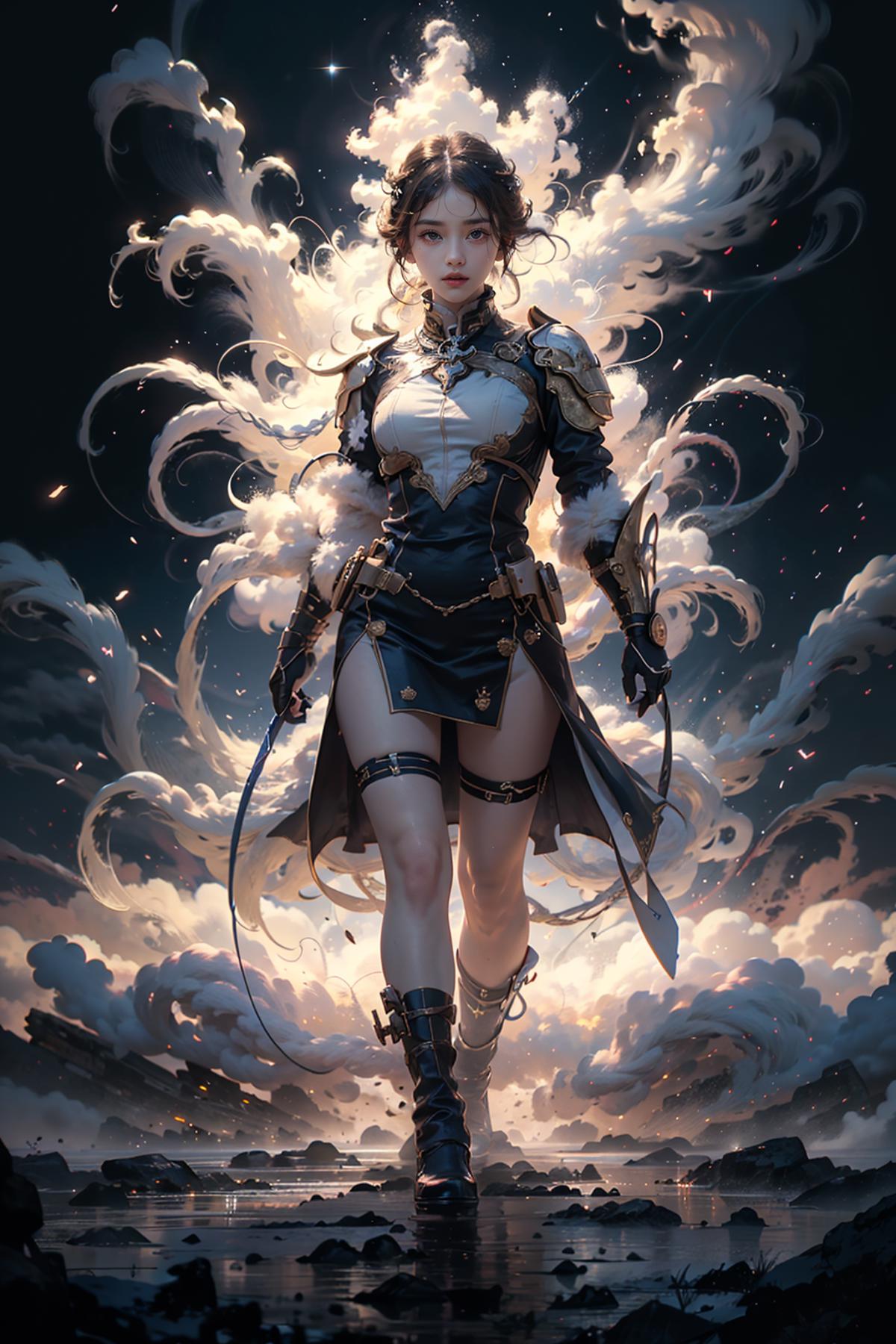 使用这个lora描述人物,可以为人物和画面增加装饰元素,如:云、火、天空、水面等等;