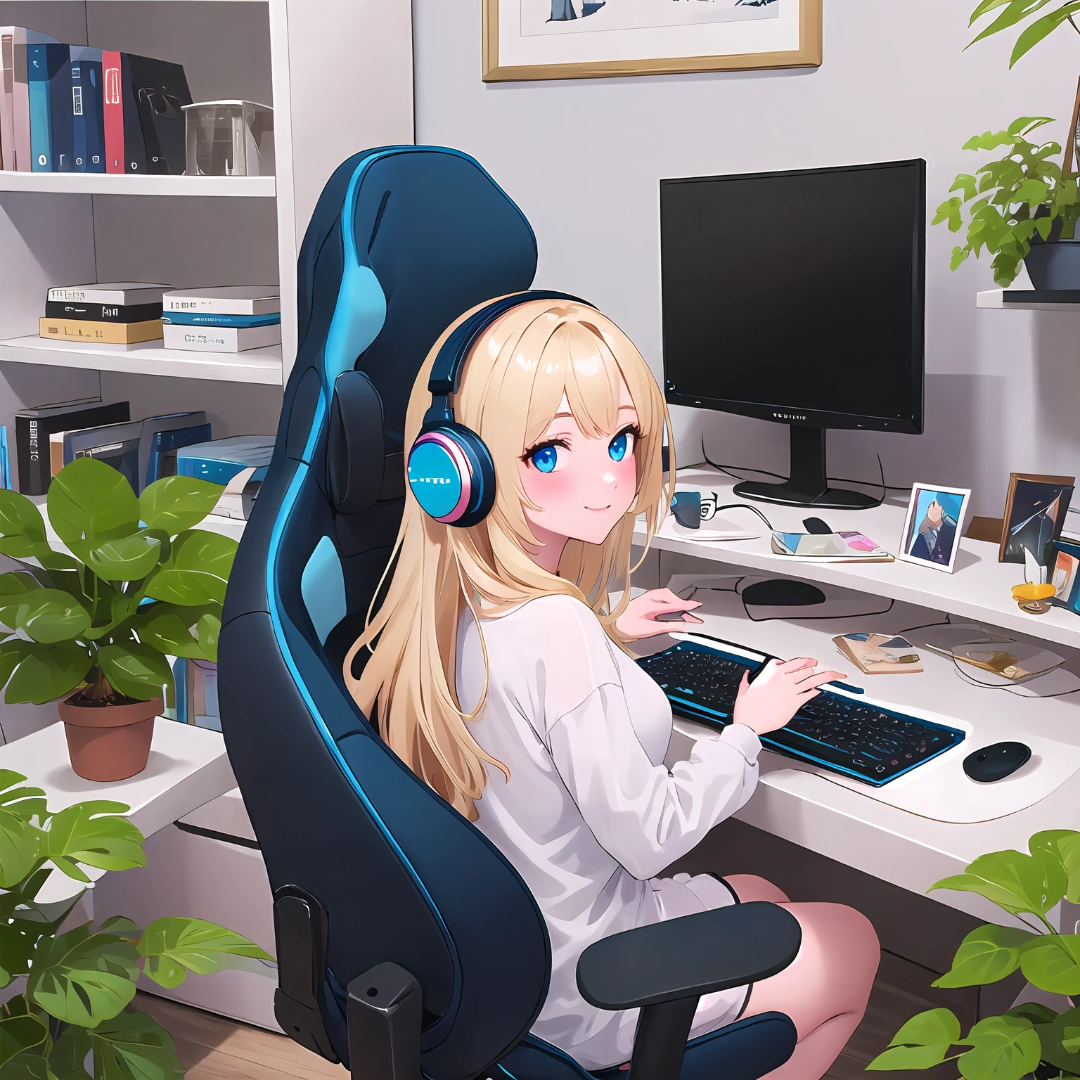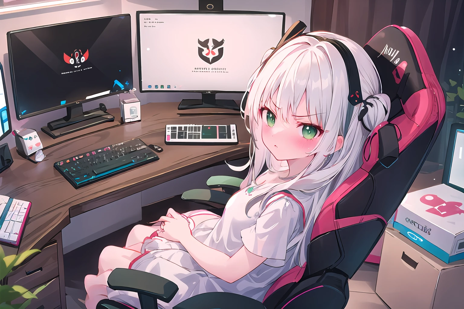 monitor, computer, playing games, headphones, on chair