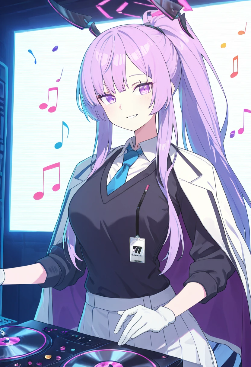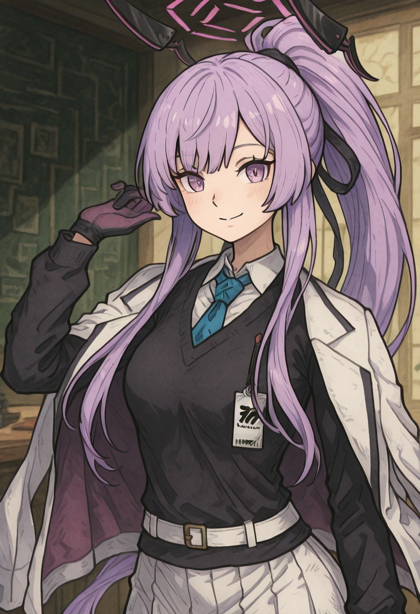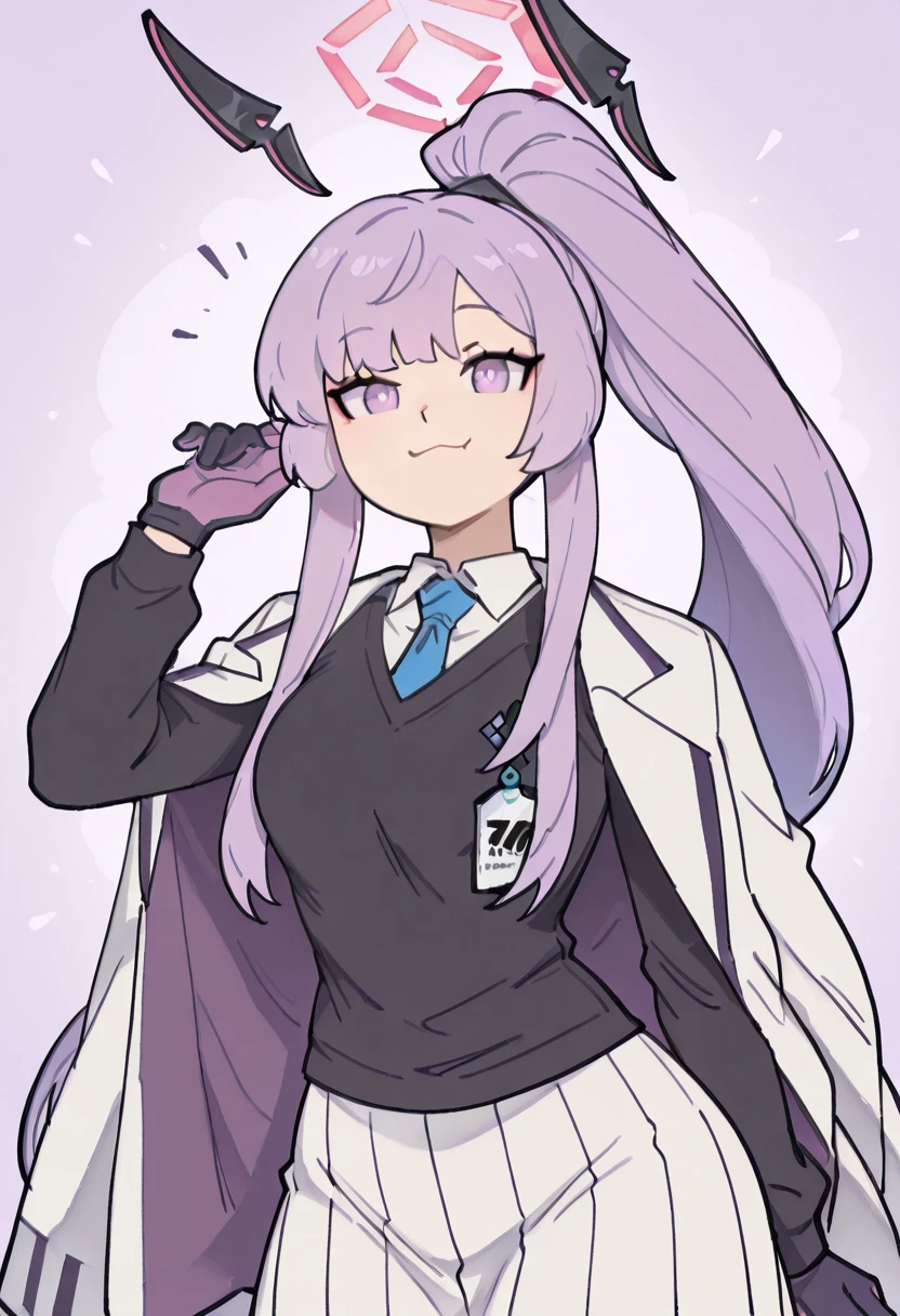 zzUtaha, purple eyes, long hair, ponytail, purple hair, long sleeves, headgear, jacket, shirt, collared shirt, floating headgear, gloves, collard shirt, necktie, black sweater, white skirt,