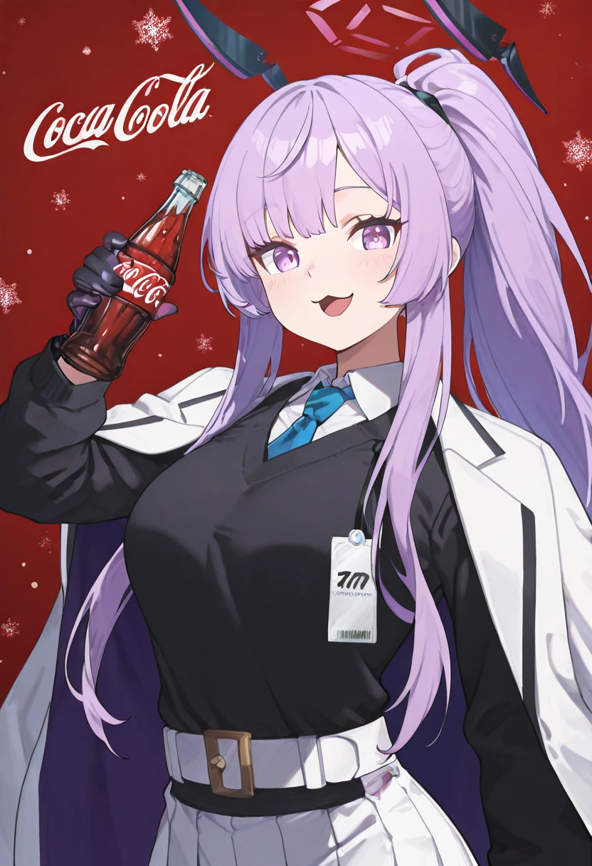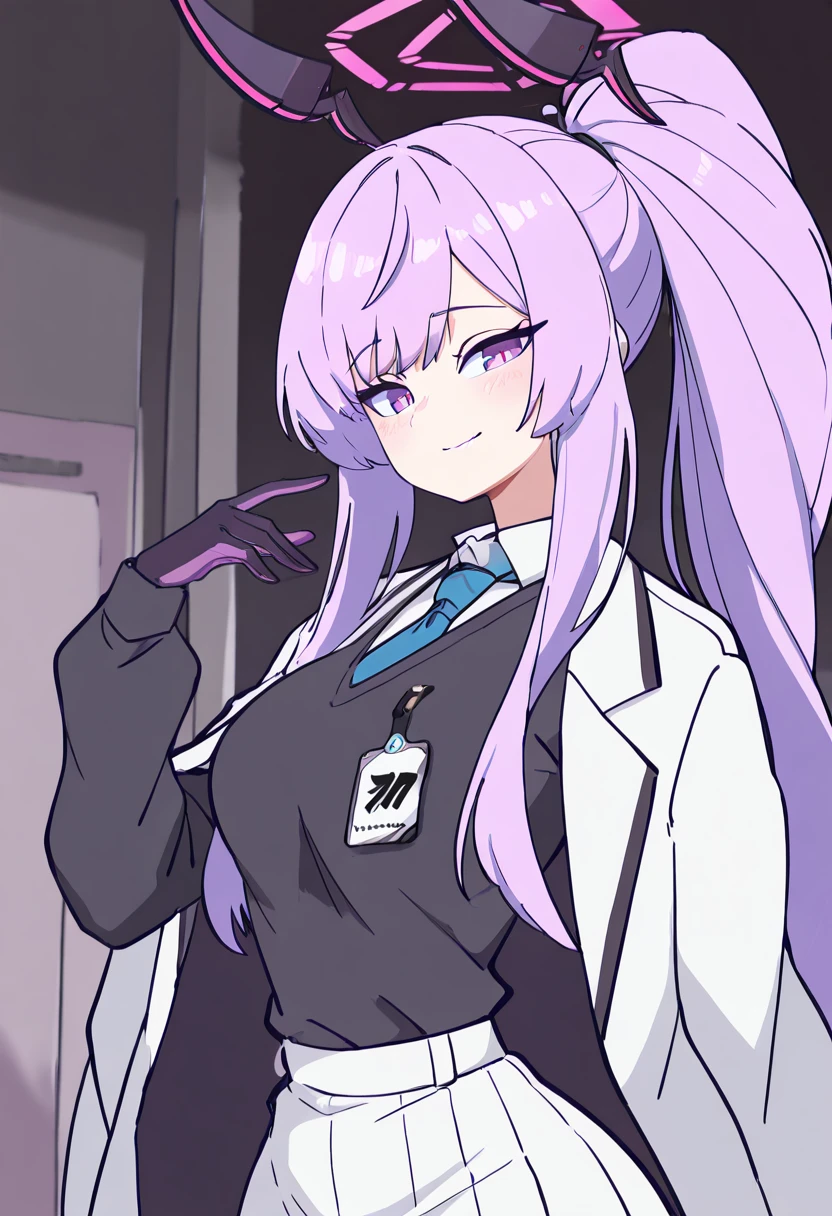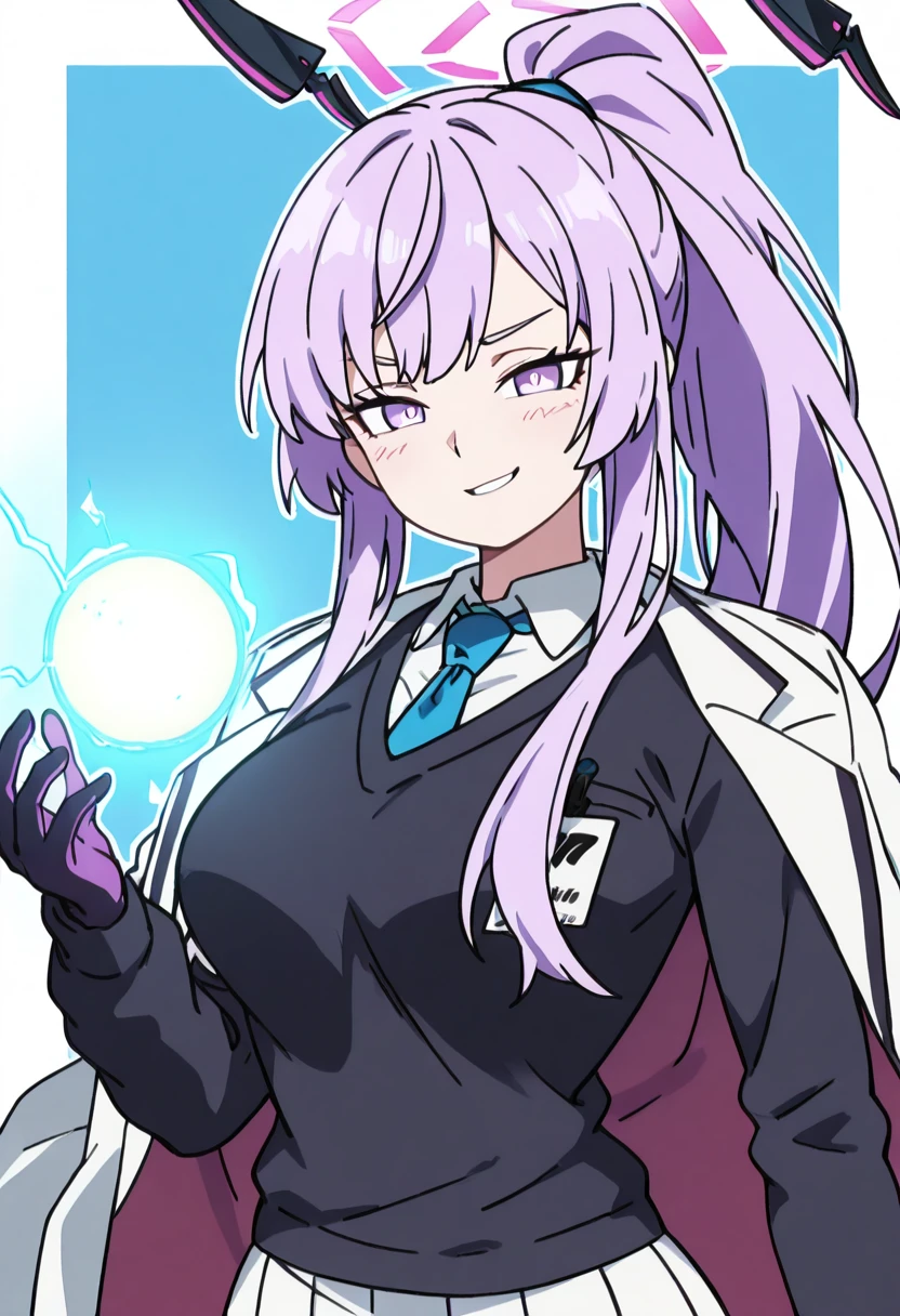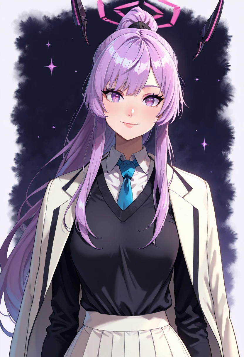 zzUtaha, purple eyes, long hair, ponytail, purple hair, long sleeves, headgear, jacket, shirt, collared shirt, floating headgear, gloves, collard shirt, necktie, black sweater, white skirt,