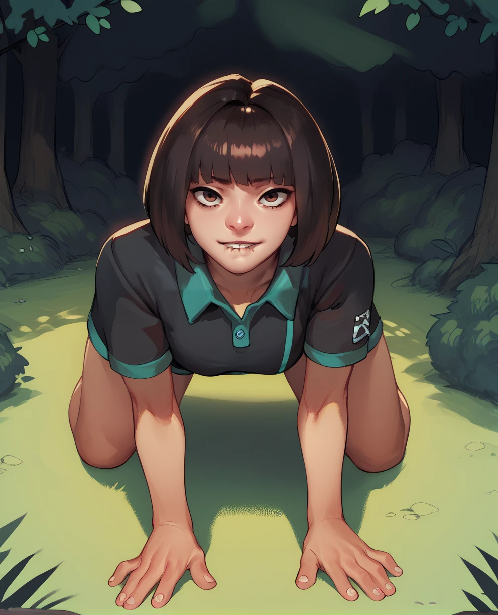 black and teal collared shirt, or collared shirt, purple socks , purple shoes, black and teal shorts, short sleeves nail polish,