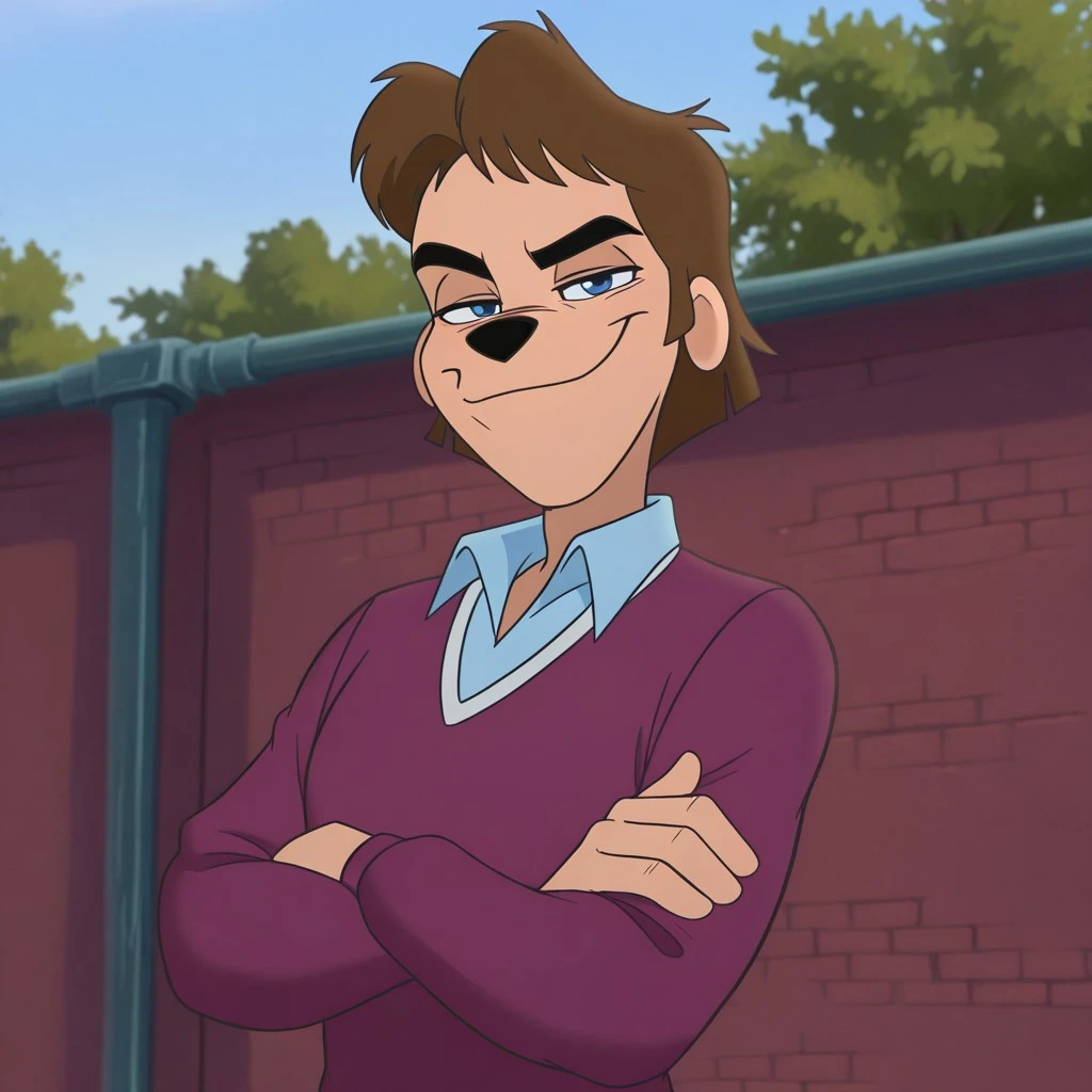 blue shirt, collared shirt, purple sweater, long sleeves, brown pants, thick brows, grey sneakers
