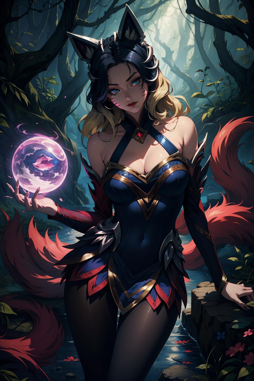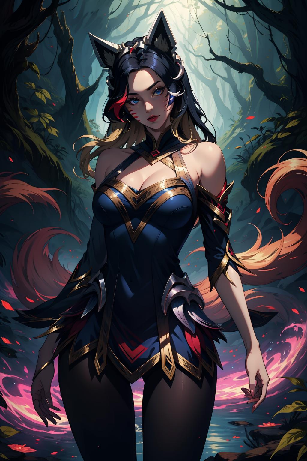 tags: coven ahri, 1girl, dress, detached sleeves, cleavage, multicolored hair, blonde hair, black hair, animal ears, pantyhose