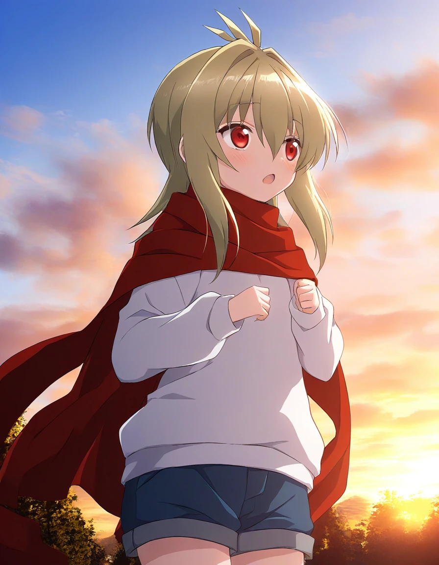 Kidouin_Makio, solo, shorts, scarf, smile, 1girl, open mouth, green hair, full body, sweater, aged down, hair intakes
