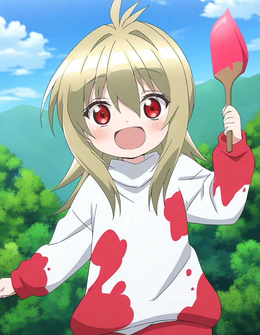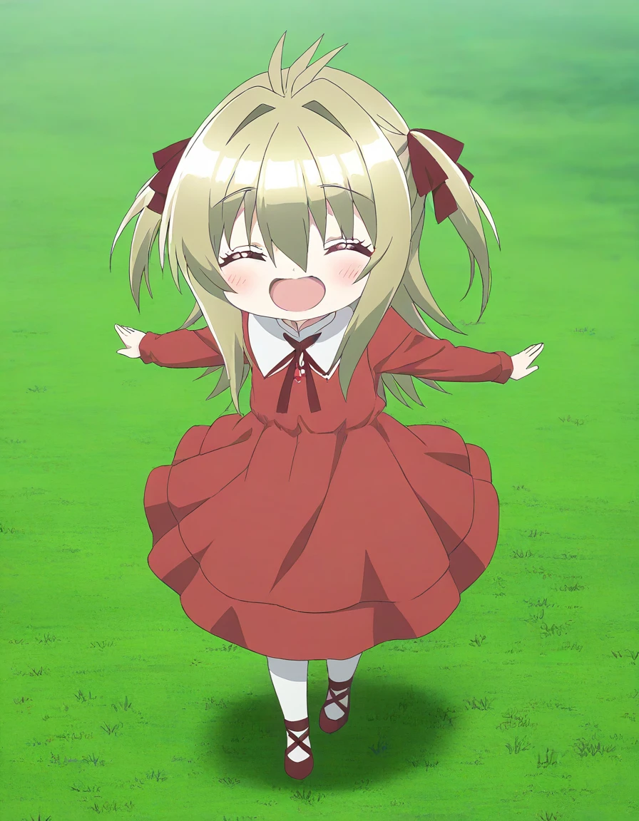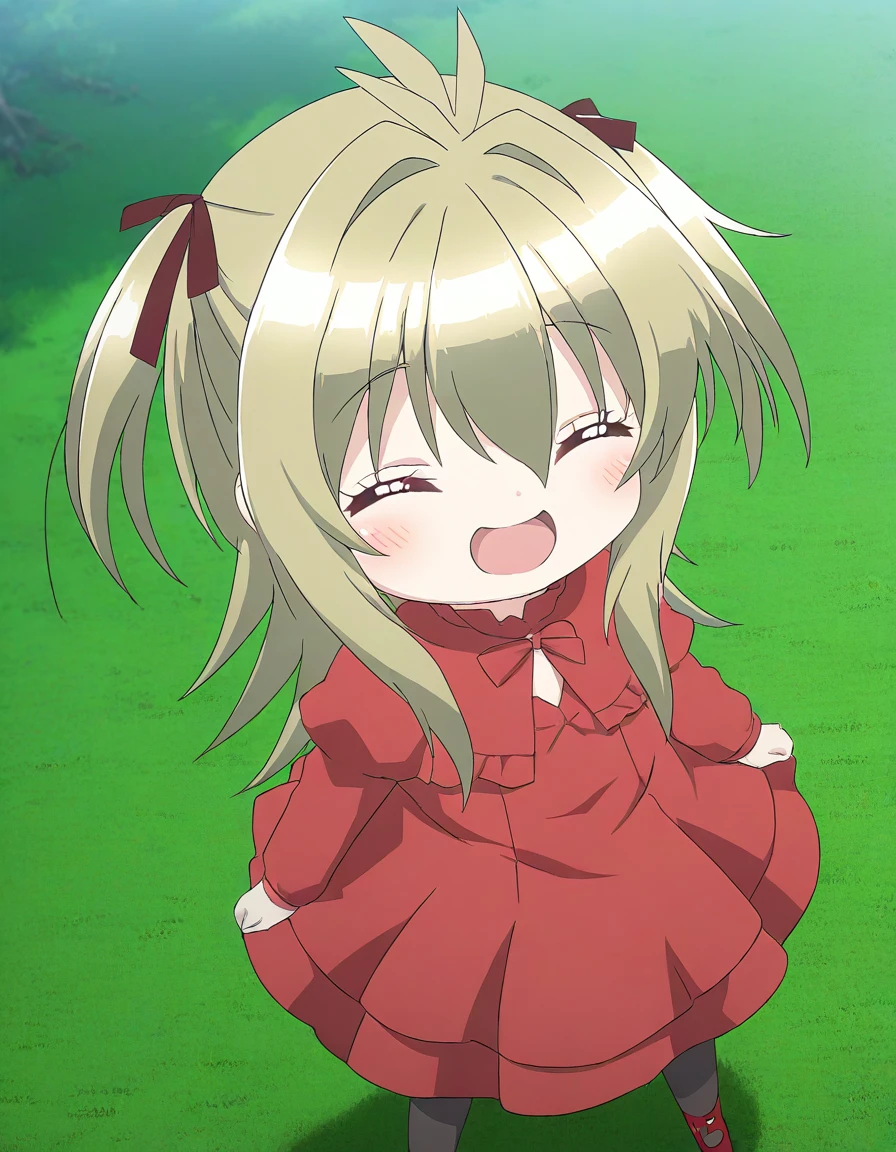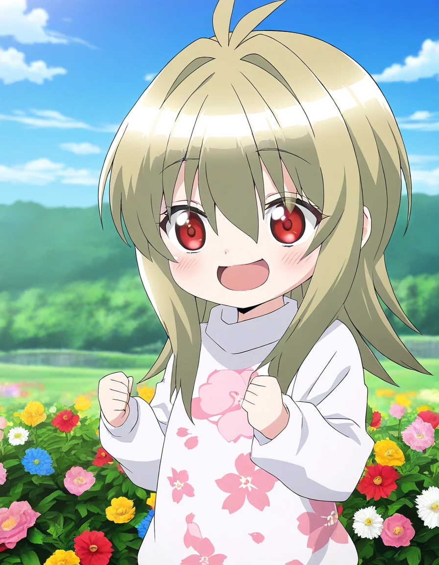 Kidouin_Makio, red eyes, blonde hair, long hair, hair between eyes, bangs, hair intakes, antenna hair, chibi,