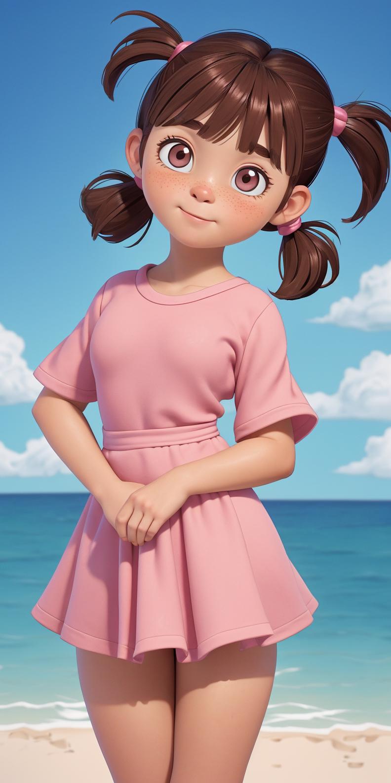 <lora:Boo_-_Monsters_Inc.:0.9> small hair, (brown hair:1.2), two pigtails held by pink hair ties, large round brown eyes, short bangs, wide-eyed expression, pink short-sleeved dress, (ocean:1.3), sand, sun, outdoors, detailed eyes, looking at the viewer, hand on hip,
