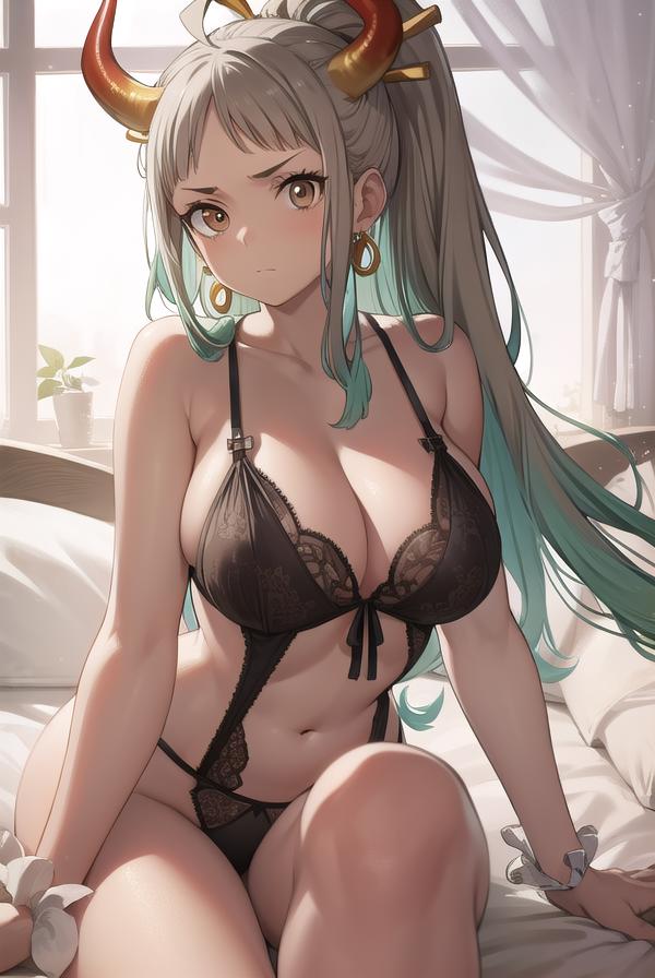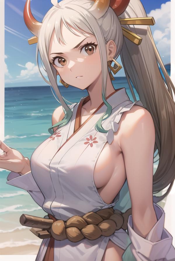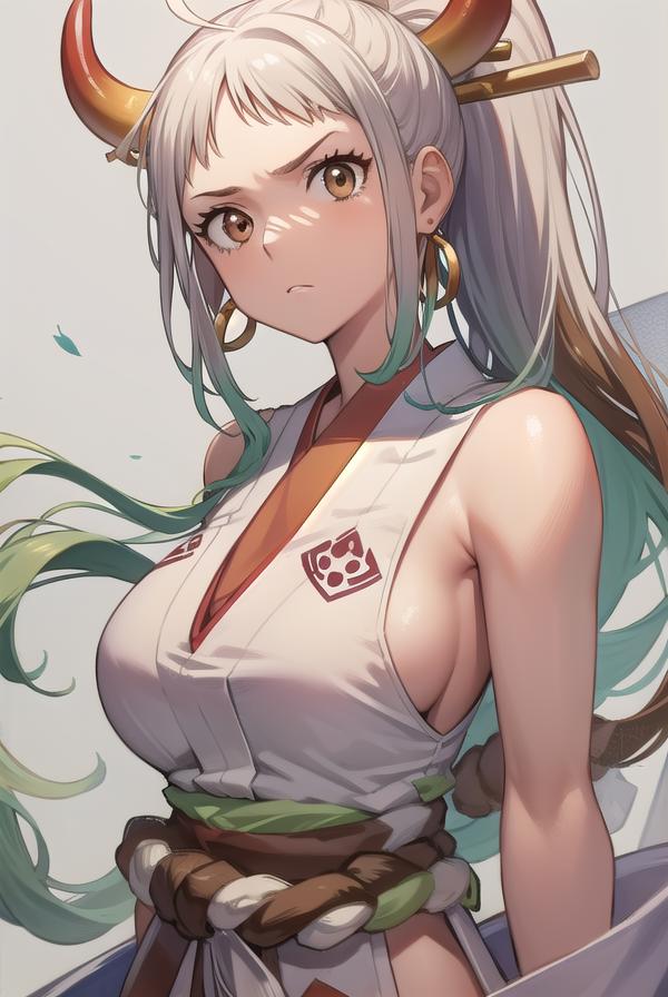 yamato, ahoge, aqua hair, (brown eyes:1.5), curled horns, earrings, green hair, grey hair, hair ornament, hair stick, high ponytail, horns, long hair, multicolored hair, multicolored horns, oni, red horns, shimenawa, sidelocks, v-shaped eyebrows, very long hair,