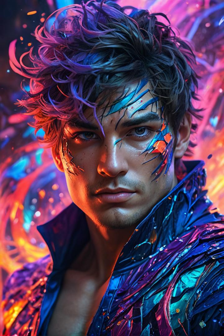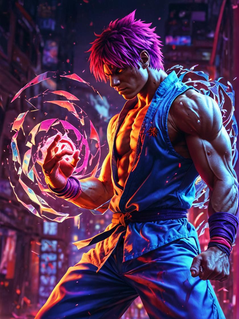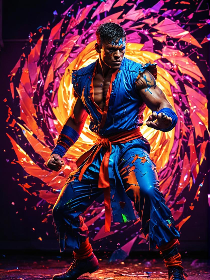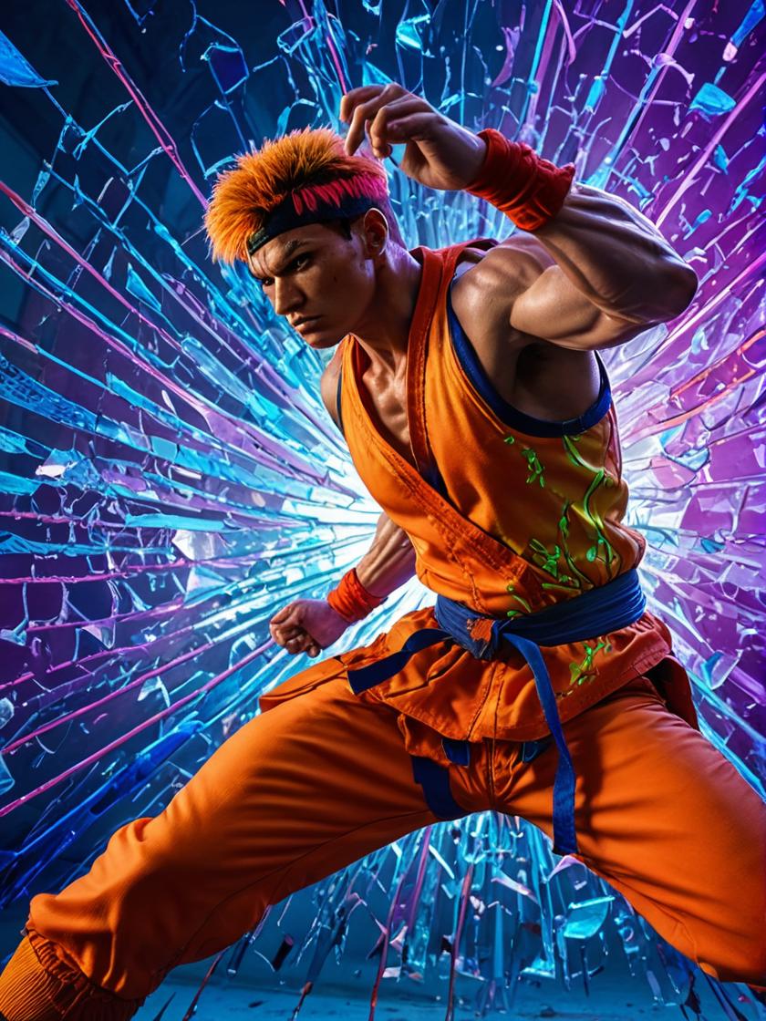 Merge 3 sliders with trigger blacklight photography, as a street fighter character, Shattered glass reflecting vibrant hues, dances in an ethereal swirl . A unique style. Examples at 0.7-1 strength.