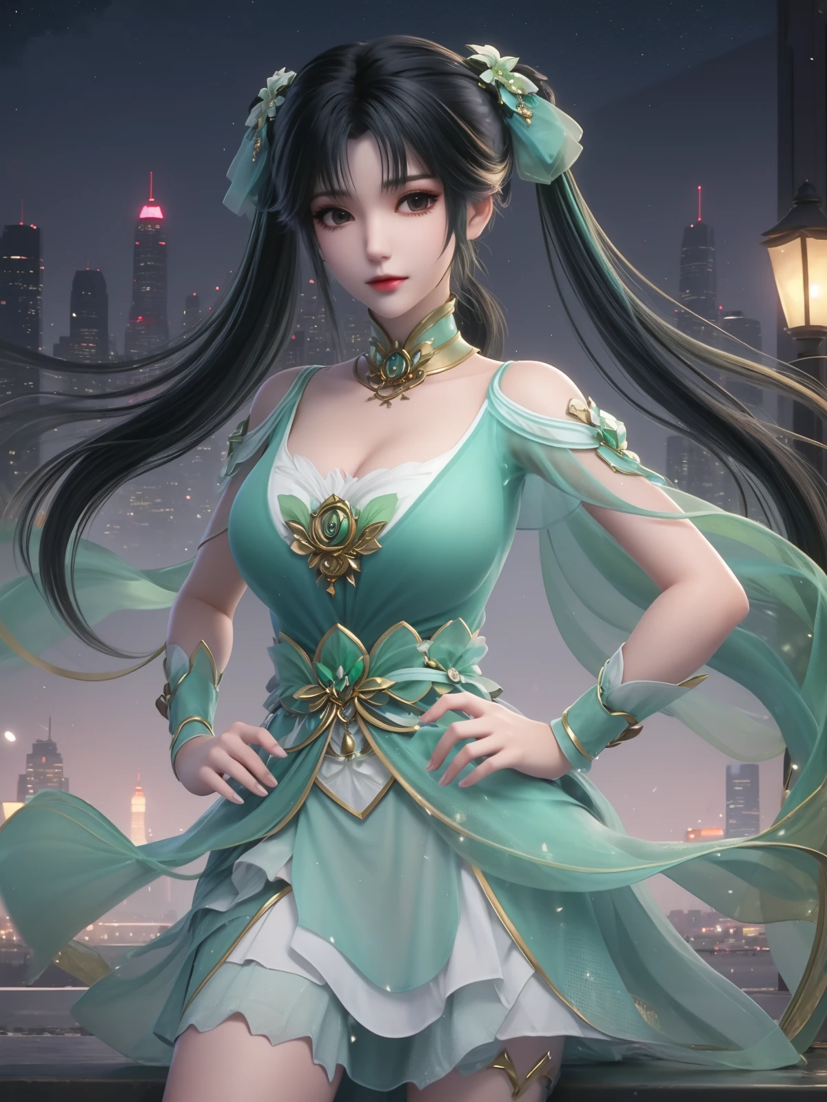 ZXbiyao, 1girl, dress, solo,black hair, twintails, long hair, hair ornament,detached collar, wrist cuffs, cityscape, night, looking at viewer,