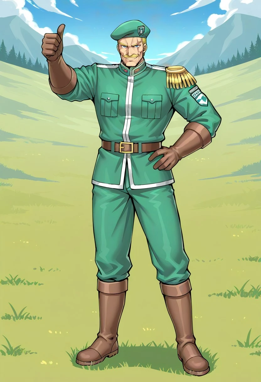 Tags: D_K_G_G, blonde hair, short hair, mustache, beret, scar across eye (remove the scar tag at distance)