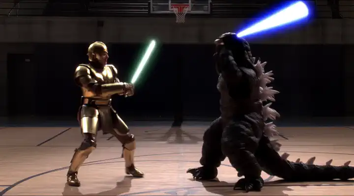 the person in the right is dressed in a godzilla halloween costume and is holding a blue light saber