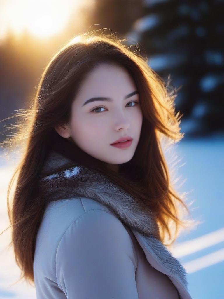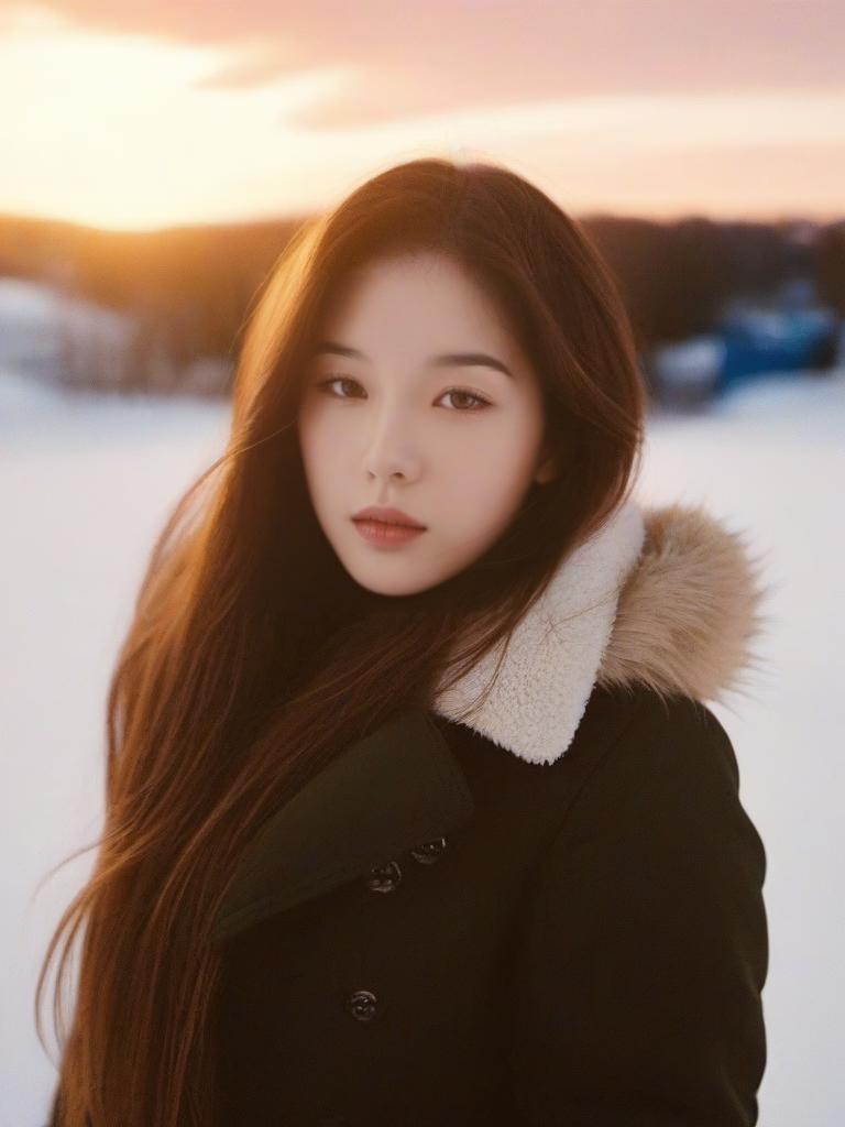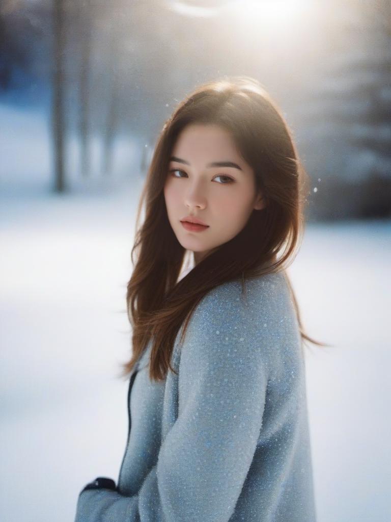 1girl, solo, photo, portrait, look at viewer, long hair, outdoor, snow, realistic, ray tracing,