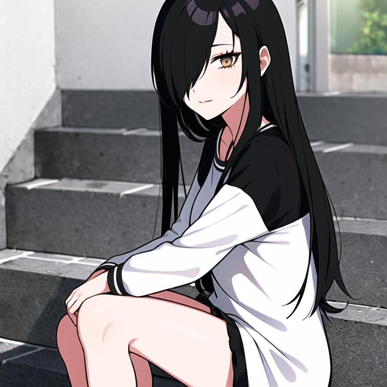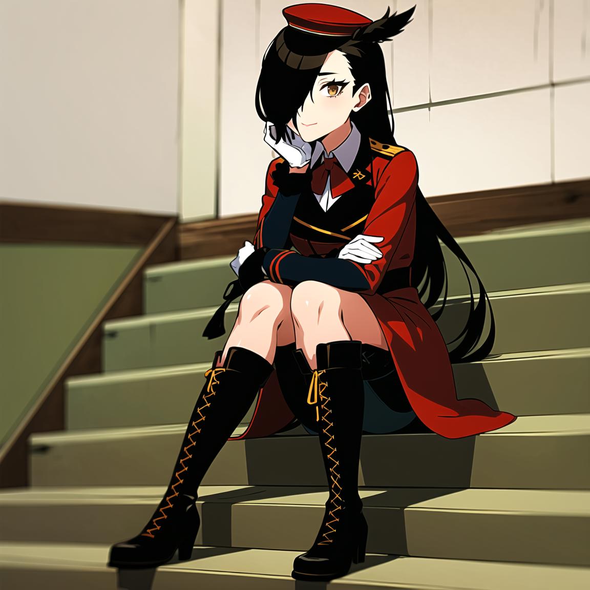 Natsumi: Natsumi, 1girl, black_hair, brown_eyes, hair over one eye, long hair (optional clothing hat, gloves, boots)