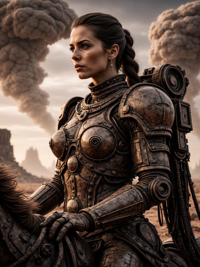 a vast post-apocalyptic wasteland stretches to the horizon, littered with rusted industrial debris and the remains of colossal machinery, In the center stands a monolithic, decayed mechanical structure, half-buried in ash and sand, like a forgotten relic of a fallen civilization, Towering plumes of dark smoke and dust rise into a stormy, overcast sky, their shapes distorted by violent winds, The atmosphere is heavy, desolate, and silent, a world long after industry, humanity, and purpose have vanished, leaving only corrosion, ruins, and the echo of catastrophic collapse